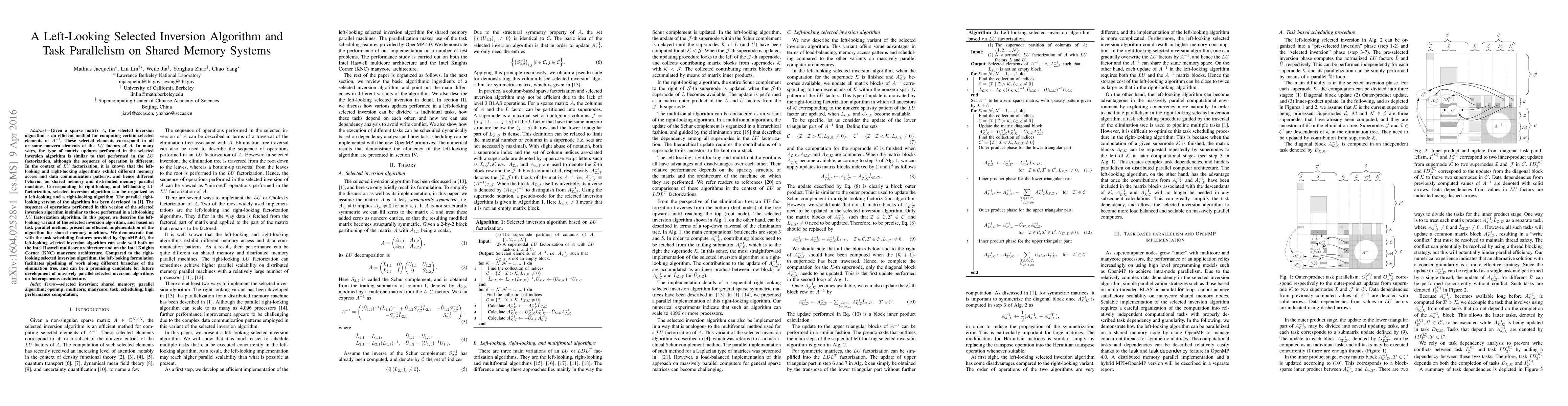 Researchers developed a left-looking variant of a sparse matrix inversion algorithm for shared memory systems, showcasing improved scalability on Intel multicore and manycore architectures.