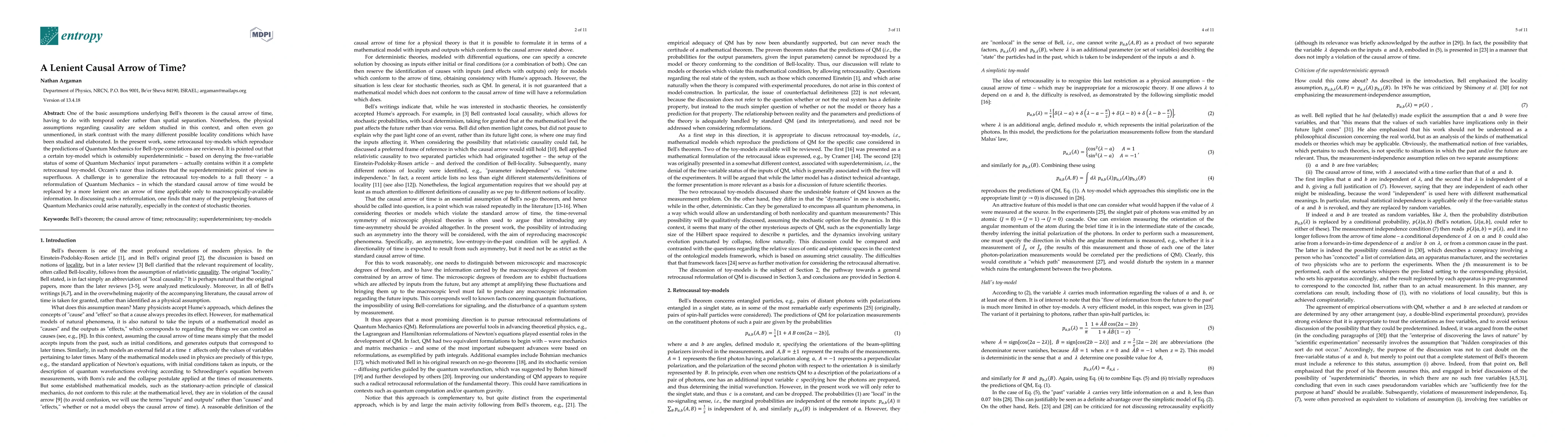 One of the basic assumptions underlying Bell's theorem is the causal arrow of time, having to do with temporal order rather than spatial separation. Nonetheless, the physical assumptions regarding causality are seldom studied in this context, and often even go unmentioned, in stark contrast with the many different possible locality conditions which have been studied and elaborated. In the present work, some retrocausal toy-models which reproduce the predictions of Quantum Mechanics for Bell-type correlations are reviewed. It is pointed out that a certain toy-model which is ostensibly superdeterministic -- based on denying the free-variable status of some of Quantum Mechanics' input parameters -- actually contains within it a complete retrocausal toy-model. Occam's razor thus indicates that the superdeterministic point of view is superfluous. A challenge is to generalize the retrocausal toy-models to a full theory -- a reformulation of Quantum Mechanics -- in which the standard causal arrow of time would be replaced by a more lenient one: an arrow of time applicable only to macroscopically-available information. In discussing such a reformulation, one finds that many of the perplexing features of Quantum Mechanics could arise naturally, especially in the context of stochastic theories.
