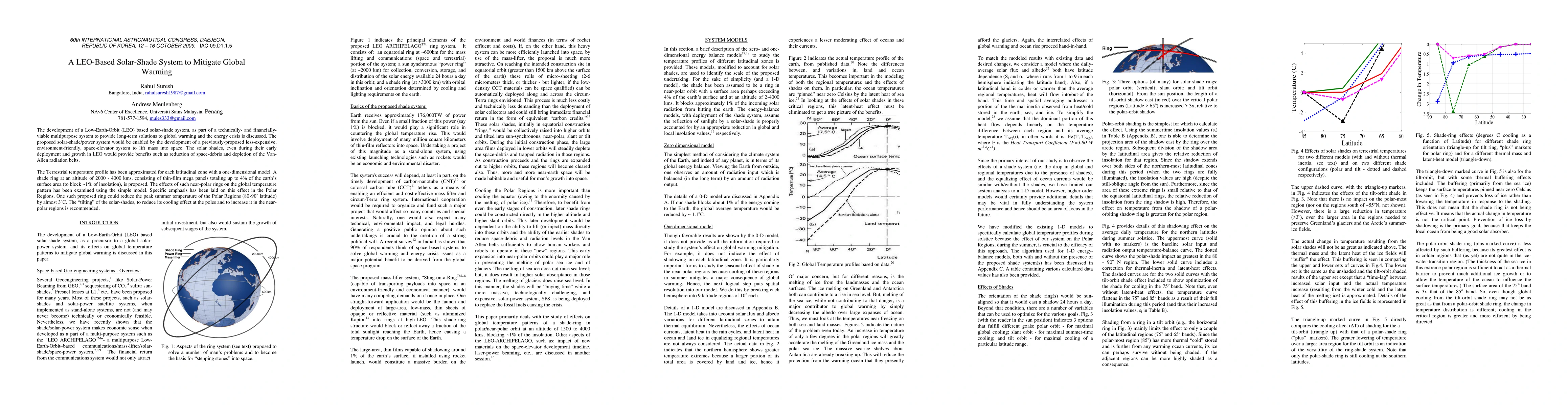The development of a Low-Earth-Orbit (LEO) based solar-shade system, as part of a technically- and financially-viable multipurpose system to provide long-term solutions to global warming and the energy crisis is discussed. The proposed solar-shade and power system would be enabled by the development of a previously-proposed less-expensive, environment-friendly, space-elevator system to lift mass into space. The solar shades, even during their early deployment and growth in LEO, would provide benefits such as reduction of space-debris and depletion of the Van Allen radiation belts.The Terrestrial temperature profile has been approximated for each latitudinal zone with a one-dimensional model. A shade ring at an altitude of 2000-4000 km, consisting of thin-film mega panels totaling up to 4% of the earths surface area (to block ~1% of insolation), is proposed. The effects of such near-polar rings on the global temperature pattern has been examined using the simple model. Specific emphasis has been laid on this effect in the Polar Regions. One such proposed ring could reduce the peak summer temperature of the Polar Regions (80-90 degree latitude) by almost 3K. The tilting of the solar-shades, to reduce their cooling effect at the poles and to increase it in the near-polar regions, is recommended.