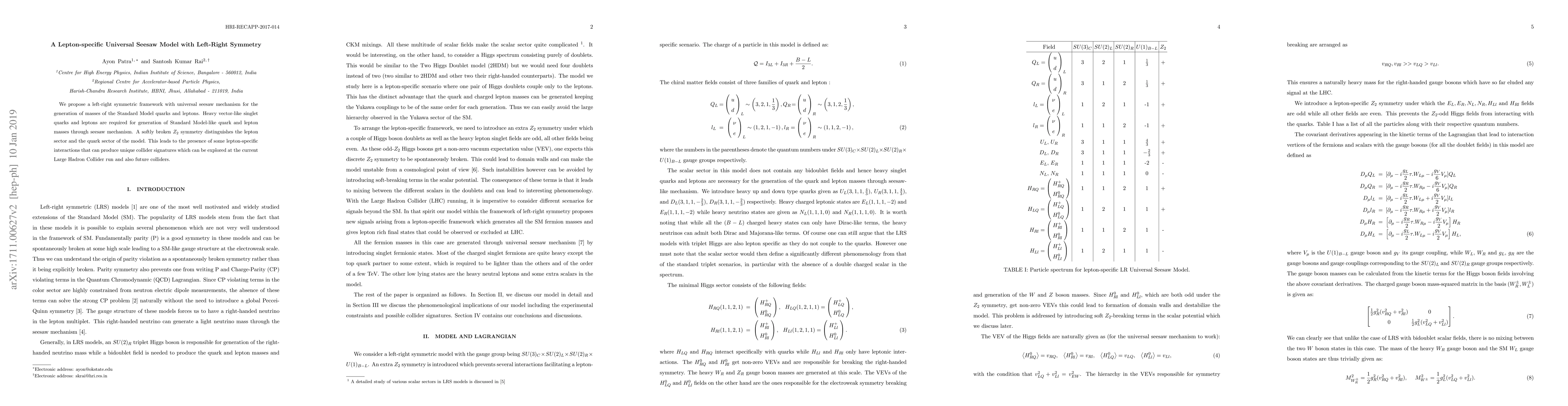 This paper proposes a left-right symmetric model with a universal seesaw mechanism to generate masses for Standard Model quarks and leptons, utilizing heavy vector-like singlets. A softly broken $Z_2$ symmetry introduces lepton-specific interactions, offering unique collider signatures for exploration at current and future colliders.