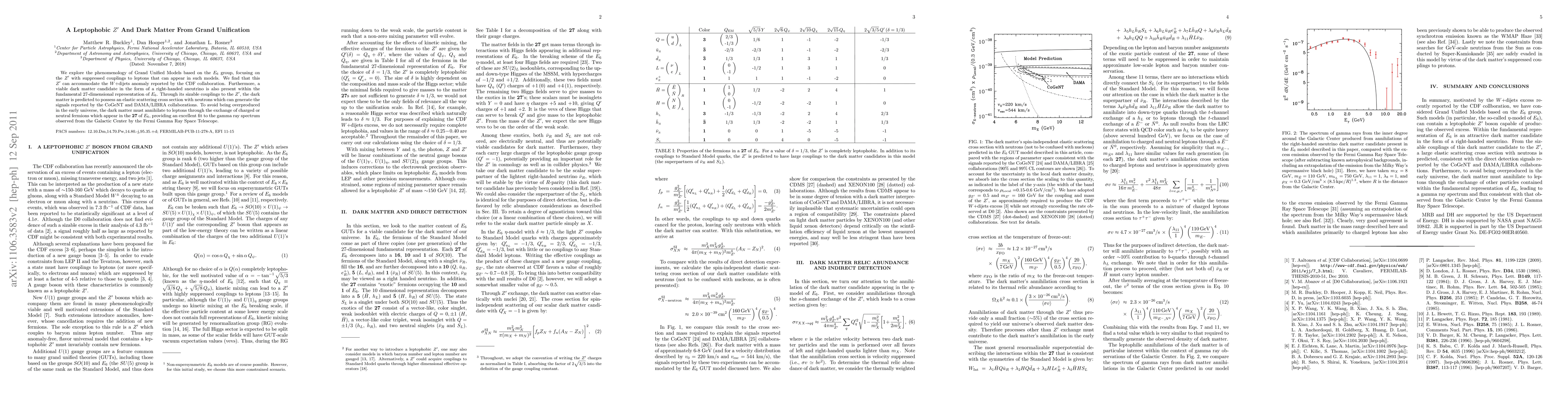 We explore the phenomenology of Grand Unified Models based on the E_6 group, focusing on the Z' with suppressed couplings to leptons that can appear in such models. We find that this Z' can accommodate the W+dijets anomaly reported by the CDF collaboration. Furthermore, a viable dark matter candidate in the form of a right-handed sneutrino is also present within the fundamental 27-dimensional representation of E_6. Through its sizable couplings to the Z', the dark matter is predicted to possess an elastic scattering cross section with neutrons which can generate the signals reported by the CoGeNT and DAMA/LIBRA collaborations. To avoid being overproduced in the early universe, the dark matter must annihilate to leptons through the exchange of charged or neutral fermions which appear in the 27 of E_6, providing an excellent fit to the gamma ray spectrum observed from the Galactic Center by the Fermi Gamma Ray Space Telescope.