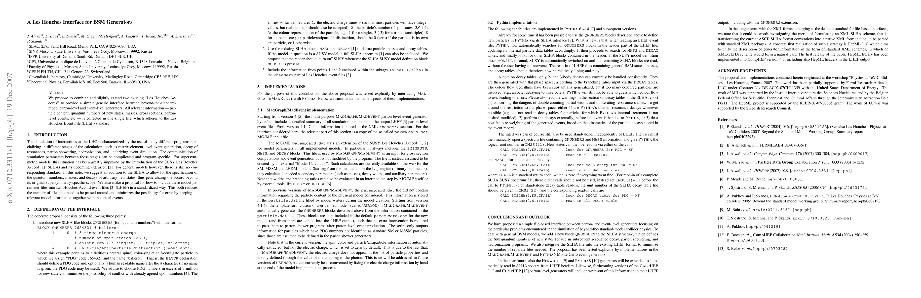 This paper proposes a unified interface for beyond-the-standard-model generators by combining and extending two existing "Les Houches Accords." It aims to standardize the collection of all relevant information, including particle content and quantum numbers, into a single file adhering to the Les Houches Event File (LHEF) standard.