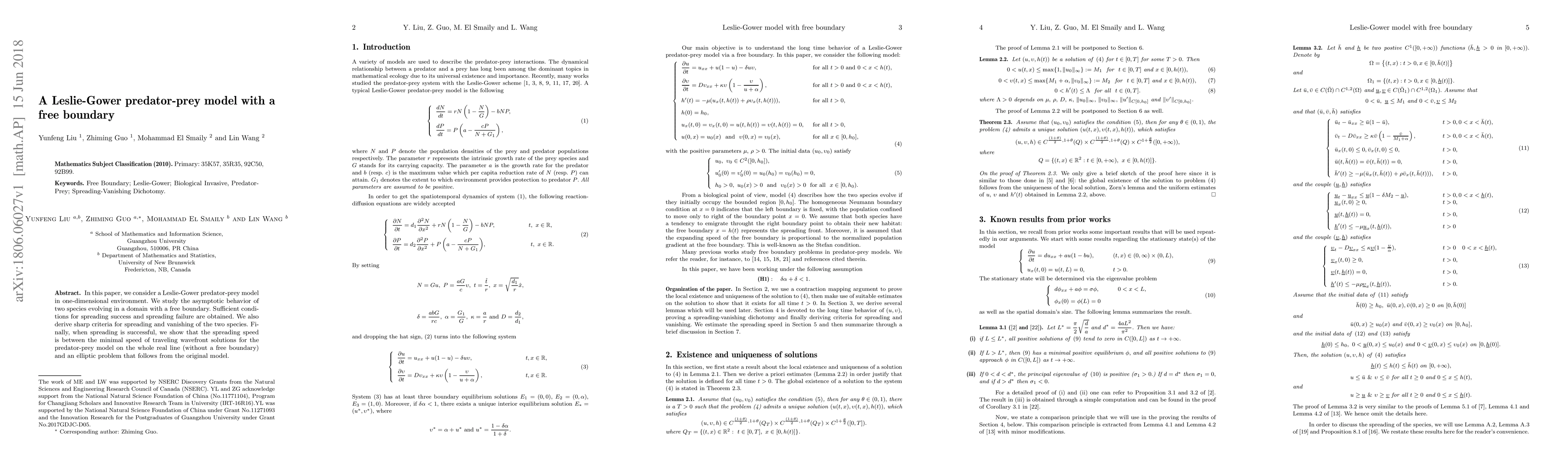 In this paper, we consider a Leslie-Gower predator-prey model in one-dimensional environment. We study the asymptotic behavior of two species evolving in a domain with a free boundary. Sufficient conditions for spreading success and spreading failure are obtained. We also derive sharp criteria for spreading and vanishing of the two species. Finally, when spreading is successful, we show that the spreading speed is between the minimal speed of traveling wavefront solutions for the predator-prey model on the whole real line (without a free boundary) and an elliptic problem that follows from the original model.