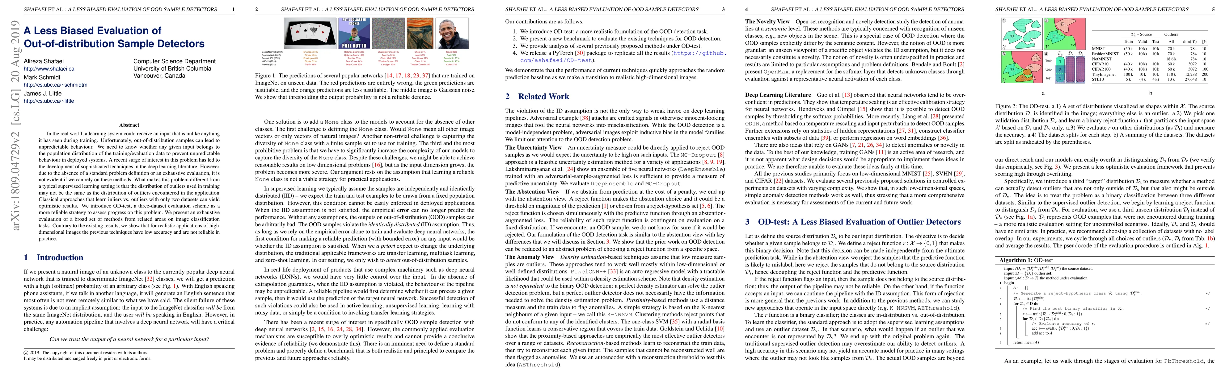 In the real world, a learning system could receive an input that is unlike anything it has seen during training. Unfortunately, out-of-distribution samples can lead to unpredictable behaviour. We need to know whether any given input belongs to the population distribution of the training/evaluation data to prevent unpredictable behaviour in deployed systems. A recent surge of interest in this problem has led to the development of sophisticated techniques in the deep learning literature. However, due to the absence of a standard problem definition or an exhaustive evaluation, it is not evident if we can rely on these methods. What makes this problem different from a typical supervised learning setting is that the distribution of outliers used in training may not be the same as the distribution of outliers encountered in the application. Classical approaches that learn inliers vs. outliers with only two datasets can yield optimistic results. We introduce OD-test, a three-dataset evaluation scheme as a more reliable strategy to assess progress on this problem. We present an exhaustive evaluation of a broad set of methods from related areas on image classification tasks. Contrary to the existing results, we show that for realistic applications of high-dimensional images the previous techniques have low accuracy and are not reliable in practice.