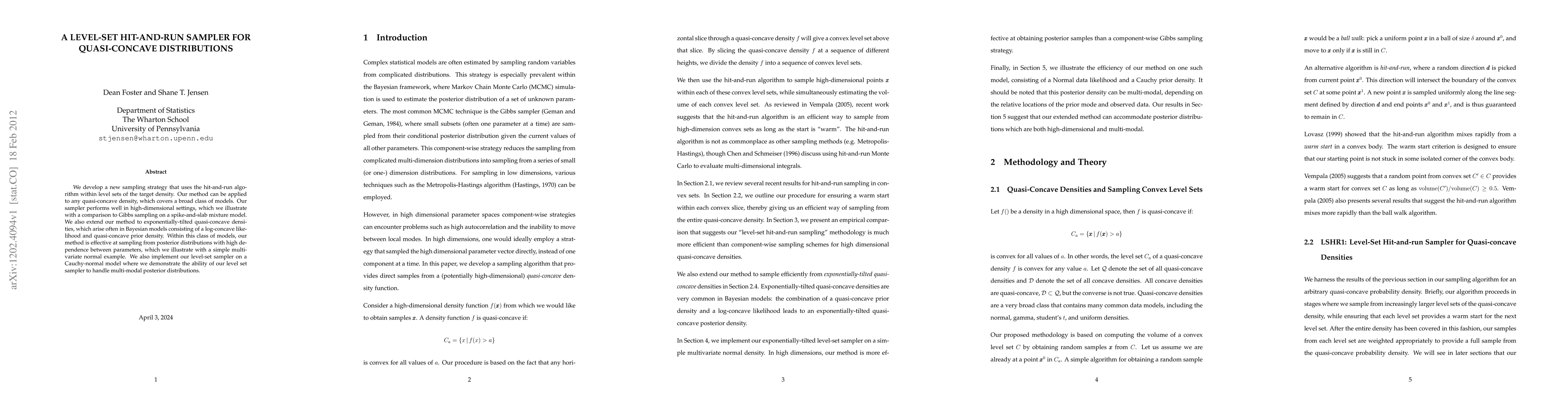 We develop a new sampling strategy that uses the hit-and-run algorithm within level sets of the target density. Our method can be applied to any quasi-concave density, which covers a broad class of models. Our sampler performs well in high-dimensional settings, which we illustrate with a comparison to Gibbs sampling on a spike-and-slab mixture model. We also extend our method to exponentially-tilted quasi-concave densities, which arise often in Bayesian models consisting of a log-concave likelihood and quasi-concave prior density. Within this class of models, our method is effective at sampling from posterior distributions with high dependence between parameters, which we illustrate with a simple multivariate normal example. We also implement our level-set sampler on a Cauchy-normal model where we demonstrate the ability of our level set sampler to handle multi-modal posterior distributions.