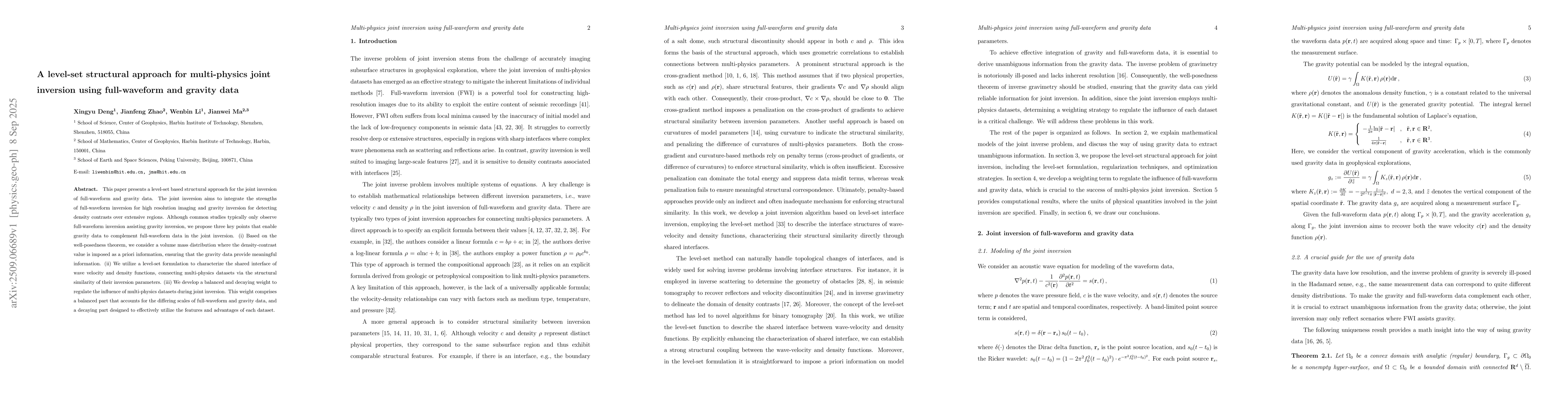 This paper presents a level-set based structural approach for the joint inversion of full-waveform and gravity data. The joint inversion aims to integrate the strengths of full-waveform inversion for high resolution imaging and gravity inversion for detecting density contrasts over extensive regions. Although common studies typically only observe full-waveform inversion assisting gravity inversion, we propose three key points that enable gravity data to complement full-waveform data in the joint inversion. (i) Based on the well-posedness theorem, we consider a volume mass distribution where the density-contrast value is imposed as a priori information, ensuring that the gravity data provide meaningful information. (ii) We utilize a level-set formulation to characterize the shared interface of wave velocity and density functions, connecting multi-physics datasets via the structural similarity of their inversion parameters. (iii) We develop a balanced and decaying weight to regulate the influence of multi-physics datasets during joint inversion. This weight comprises a balanced part that accounts for the differing scales of full-waveform and gravity data, and a decaying part designed to effectively utilize the features and advantages of each dataset.