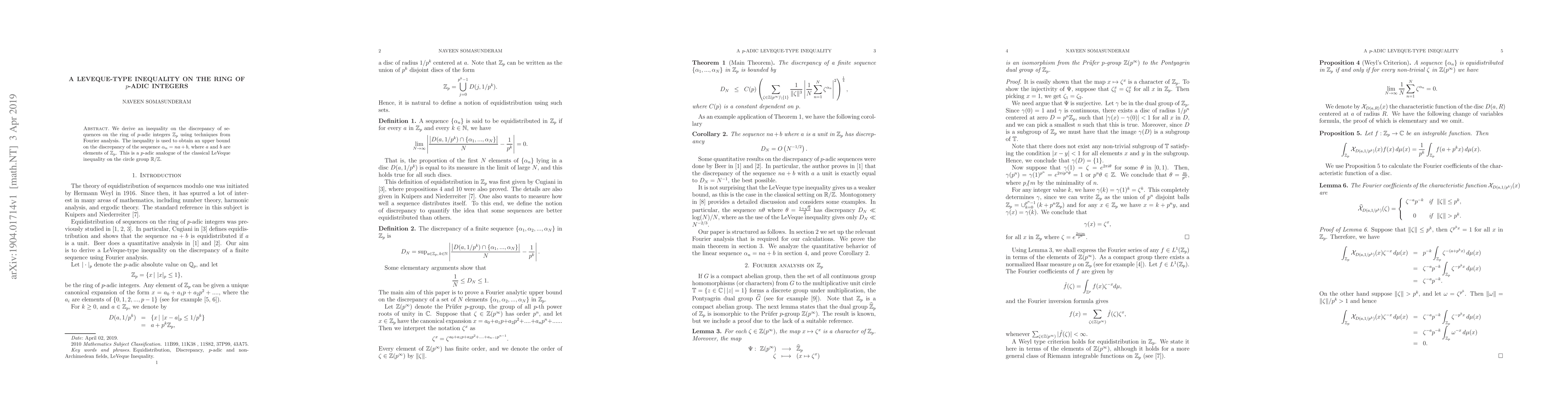 Researchers derived a p-adic analogue of LeVeque's inequality for sequences on the ring of p-adic integers, using Fourier analysis to establish an upper bound on discrepancy.
