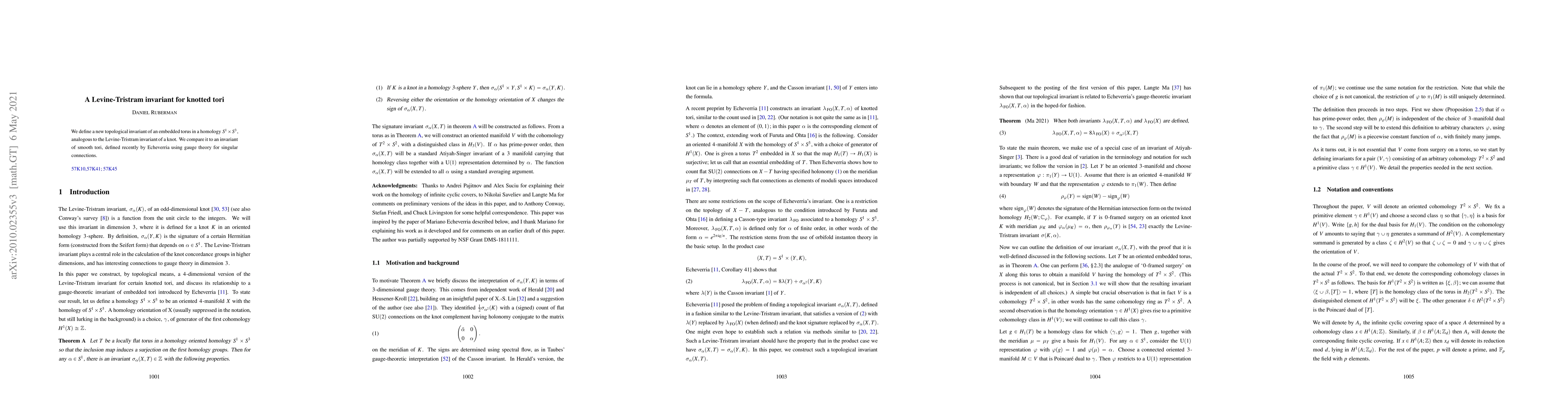 Echeverria recently introduced an invariant for a smoothly embedded torus in a homology $S^1\times S^3$, using gauge theory for singular connections. We define a new topological invariant of such an embedded torus, analogous to the classical Levine-Tristram invariant of a knot. In the 3-dimensional situation, a count of singular connections on a knot complement reproduces the Levine-Tristram invariant. We compute the invariant for a number of examples embedded tori, and show that our topological invariant is the same as what one might expect from Echeverria's invariant. Langte Ma has subsequently shown this in general.