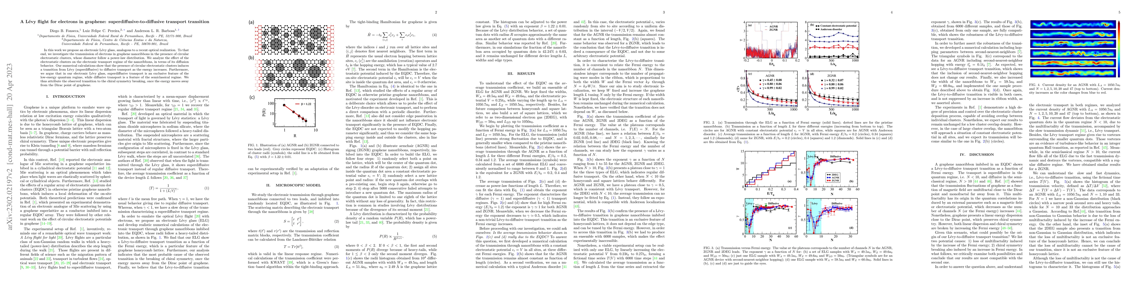 In this work we propose an electronic L\'evy flight device, analogous to a recent optical realization. To that end, we investigate the transmission of electrons in graphene nanoribbons in the presence of circular electrostatic clusters, whose diameter follow a power-law distribution. We analyze the effect of the electrostatic clusters on the electronic transport regime of the nanoribbons, in terms of its diffusion behavior. Our numerical calculations show that the presence of circular electrostatic clusters induces a transition from L\'evy (superdiffusive) to diffusive transport as the energy increases. Furthermore, we argue that in our electronic L\'evy flight device, superdiffusive transport is an exclusive feature of the low-energy quantum regime, while diffusive transport is a feature of the semiclassical regime. Therefore, we attribute the observed transition to the chiral symmetry breaking, once the energy moves away from the Dirac point of graphene.