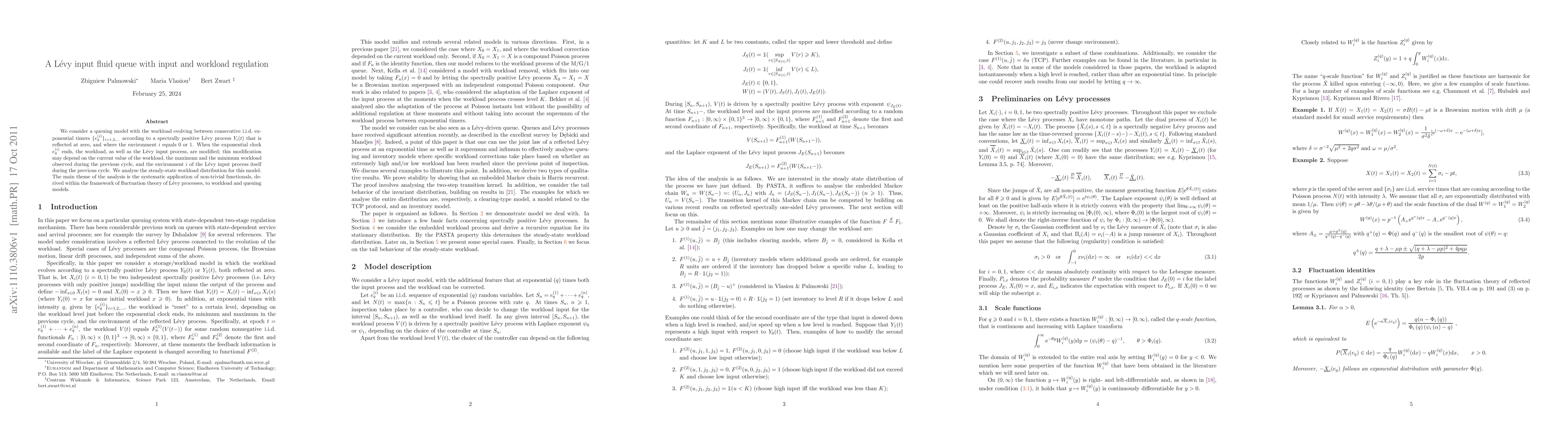 We consider a queuing model with the workload evolving between consecutive i.i.d.\ exponential timers $\{e_q^{(i)}\}_{i=1,2,...}$ according to a spectrally positive L\'evy process $Y_i(t)$ that is reflected at zero, and where the environment $i$ equals 0 or 1. When the exponential clock $e_q^{(i)}$ ends, the workload, as well as the L\'evy input process, are modified; this modification may depend on the current value of the workload, the maximum and the minimum workload observed during the previous cycle, and the environment $i$ of the L\'evy input process itself during the previous cycle. We analyse the steady-state workload distribution for this model. The main theme of the analysis is the systematic application of non-trivial functionals, derived within the framework of fluctuation theory of L\'evy processes, to workload and queuing models.