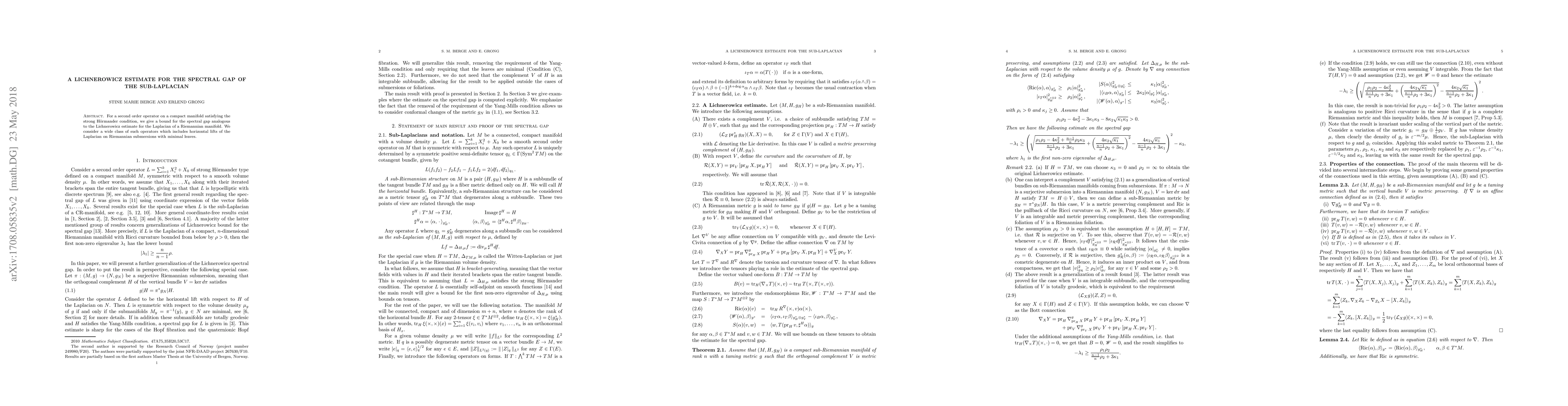 This paper establishes a Lichnerowicz-type estimate for the spectral gap of a sub-Laplacian on a compact manifold, extending the classical result for the Riemannian Laplacian. The estimate applies to a broad class of operators, including horizontal lifts of the Laplacian from Riemannian submersions.