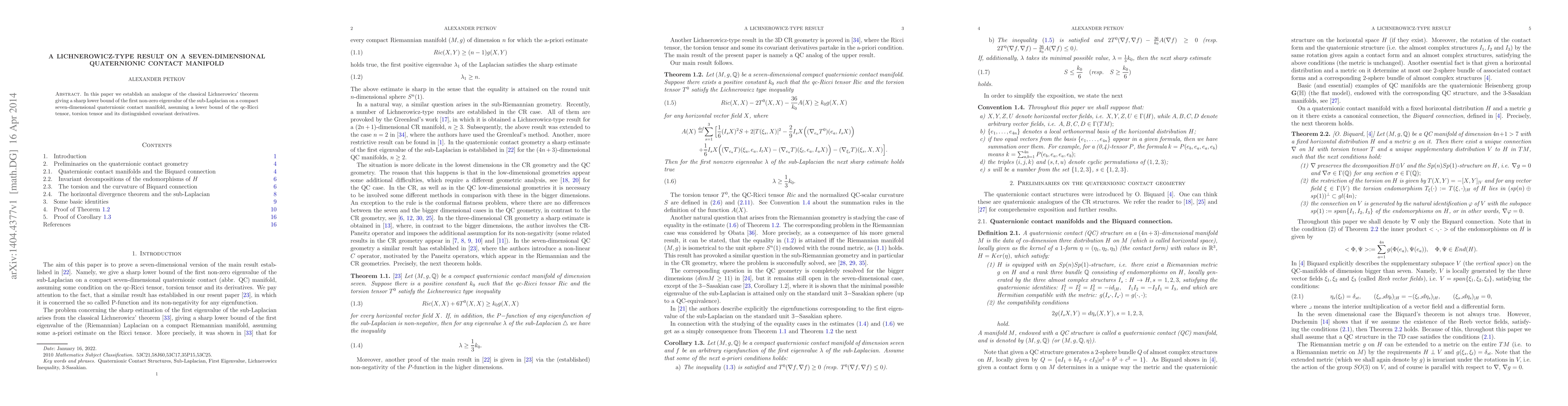 In this paper we establish an analogue of the classical Lichnerowicz' theorem giving a sharp lower bound of the first non-zero eigenvalue of the sub-Laplacian on a compact seven-dimensional quaternionic contact manifold, assuming a lower bound of the qc-Ricci tensor, torsion tensor and its distinguished covariant derivatives.