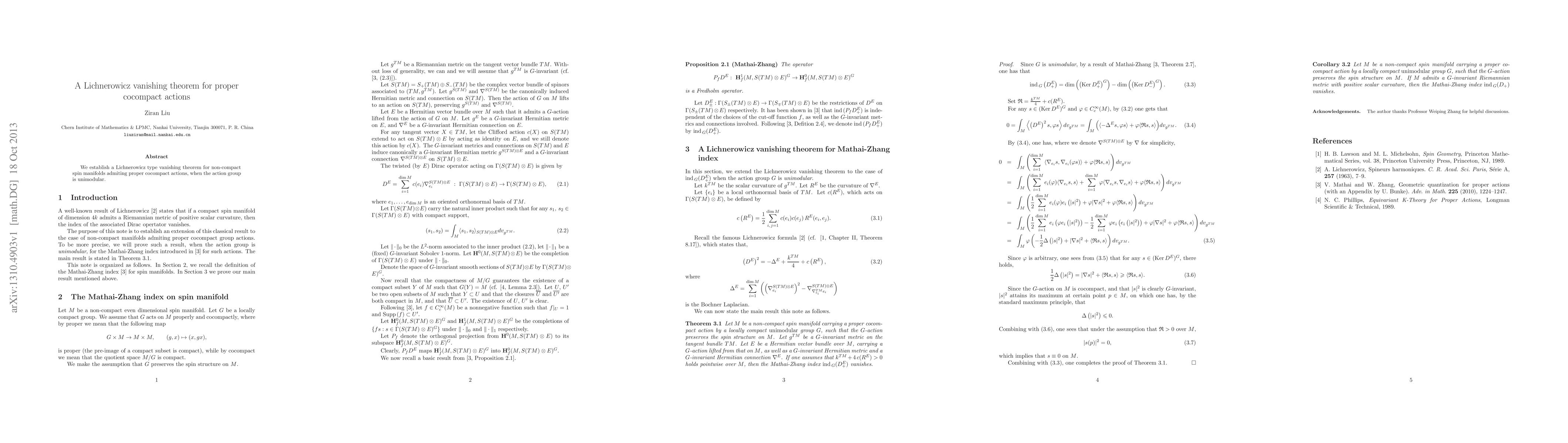 Summary: This paper proves a Lichnerowicz vanishing theorem for non-compact spin manifolds with proper cocompact actions, under the condition that the action group is unimodular. The result extends classical vanishing theorems to a broader class of manifolds.