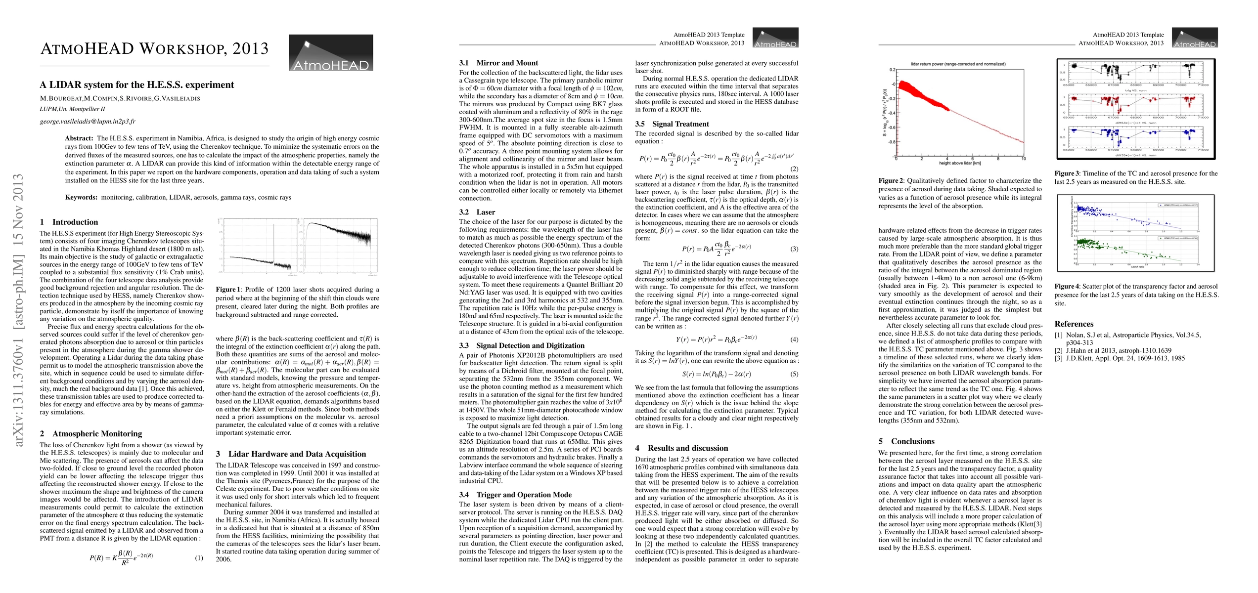 The H.E.S.S. experiment in Namibia, Africa, is designed to study the origin of high energy cosmic rays from 100 Gev to few tens of TeV, using the Cherenkov technique. To minimize the systematic errors on the derived fluxes of the measured sources, one has to calculate the impact of the atmospheric properties, namely the extinction parameter a. A LIDAR can provide this kind of information within the detectable energy range of the experiment. In this paper we report on the hardware components, operation and data taking of such a system installed on the HESS site for the last three years.