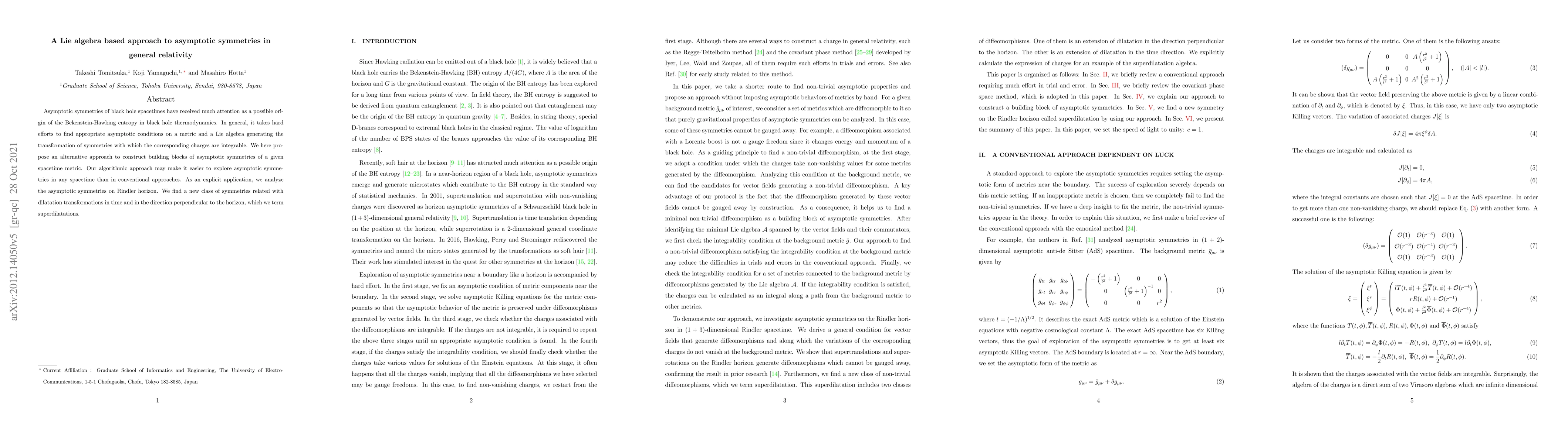 This paper proposes a Lie algebra-based algorithmic approach to construct asymptotic symmetries in general relativity, simplifying the exploration of such symmetries compared to conventional methods. As an example, it identifies a new class of symmetries, termed superdilatations, on the Rindler horizon.