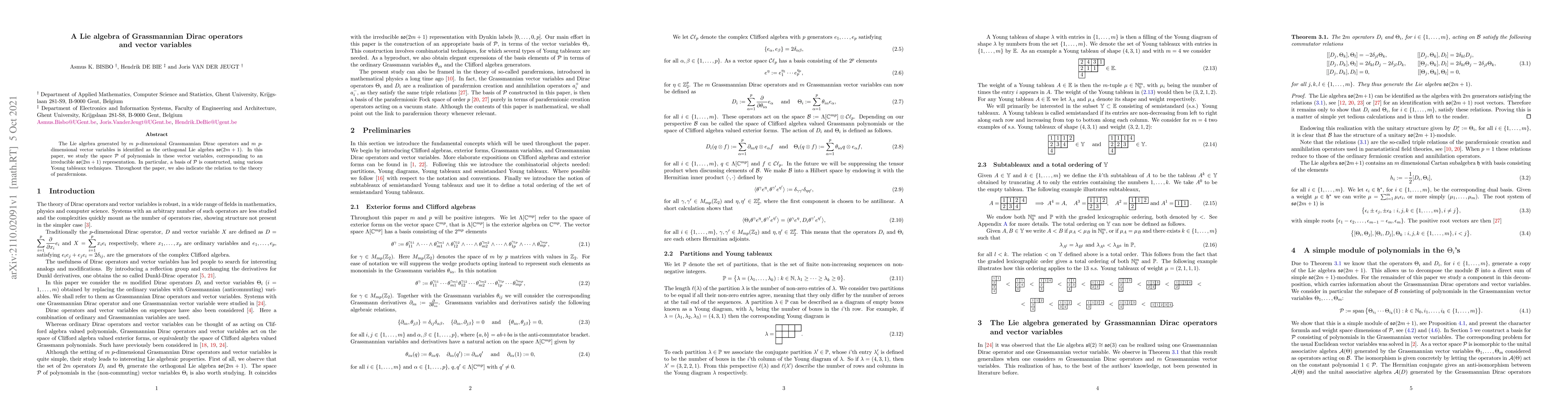 This paper identifies the Lie algebra generated by Grassmannian Dirac operators and vector variables as $\mathfrak{so}(2m+1)$. It constructs a basis for the space of polynomials corresponding to an irreducible $\mathfrak{so}(2m+1)$ representation using Young tableaux techniques and discusses its relation to parafermion theory.