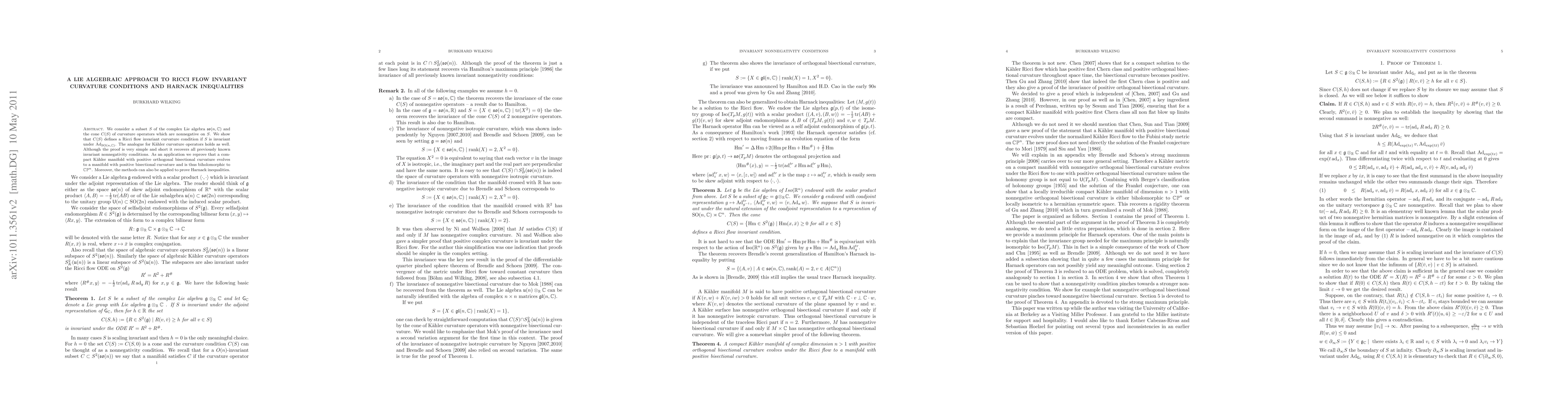 We consider a subset $S$ of the complex Lie algebra $\so(n,\C)$ and the cone $C(S)$ of curvature operators which are nonnegative on $S$. We show that $C(S)$ defines a Ricci flow invariant curvature condition if $S$ is invariant under $\Ad_{\SO(n,\C)}$. The analogue for K\"ahler curvature operators holds as well. Although the proof is very simple and short it recovers all previously known invariant nonnegativity conditions. As an application we reprove that a compact K\"ahler manifold with positive orthogonal bisectional curvature evolves to a manifold with positive bisectional curvature and is thus biholomorphic to $\CP^n$. Moreover, the methods can also be applied to prove Harnack inequalities. In addition to an earlier version the paper contains some remarks on negative results for Harnack inequalities.