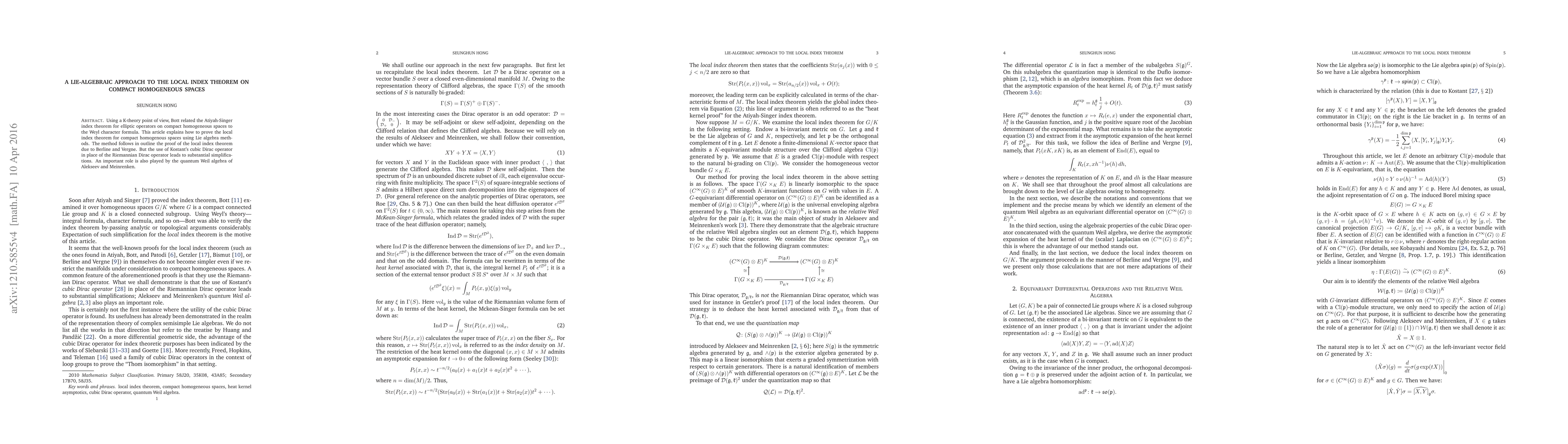 Using a K-theory point of view, Bott related the Atiyah-Singer index theorem for elliptic operators on compact homogeneous spaces to the Weyl character formula. This article explains how to prove the local index theorem for compact homogenous spaces using Lie algebra methods. The method follows in outline the proof of the local index theorem due to Berline and Vergne. But the use of Kostant's cubic Dirac operator in place of the Riemannian Dirac operator leads to substantial simplifications. An important role is also played by the quantum Weil algebra of Alekseev and Meinrenken.