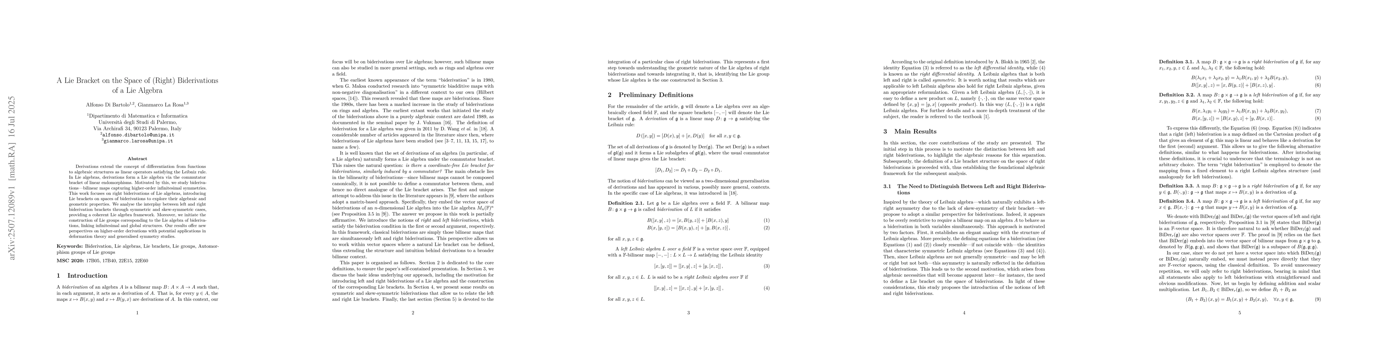 Derivations extend the concept of differentiation from functions to algebraic structures as linear operators satisfying the Leibniz rule. In Lie algebras, derivations form a Lie algebra via the commutator bracket of linear endomorphisms. Motivated by this, we study biderivations-bilinear maps capturing higher-order infinitesimal symmetries. This work focuses on right biderivations of Lie algebras, introducing Lie brackets on spaces of biderivations to explore their algebraic and geometric properties. We analyse the interplay between left and right biderivation brackets through symmetric and skew-symmetric cases, providing a coherent Lie algebra framework. Moreover, we initiate the construction of Lie groups corresponding to the Lie algebra of biderivations, linking infinitesimal and global structures. Our results offer new perspectives on higher-order derivations with potential applications in deformation theory and generalised symmetry studies.