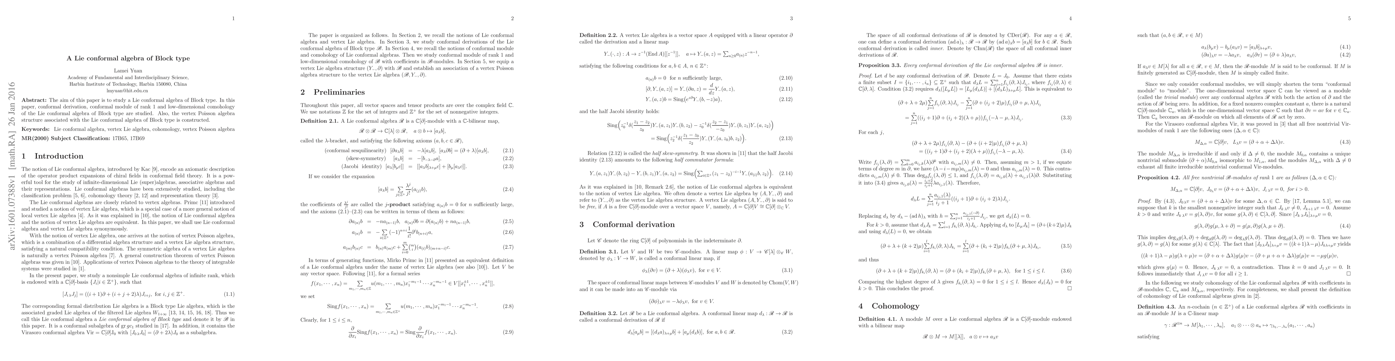 This paper investigates a Lie conformal algebra of Block type, focusing on its conformal derivation, rank 1 conformal module, and low-dimensional cohomology. Additionally, it constructs a vertex Poisson algebra structure linked to this conformal algebra.