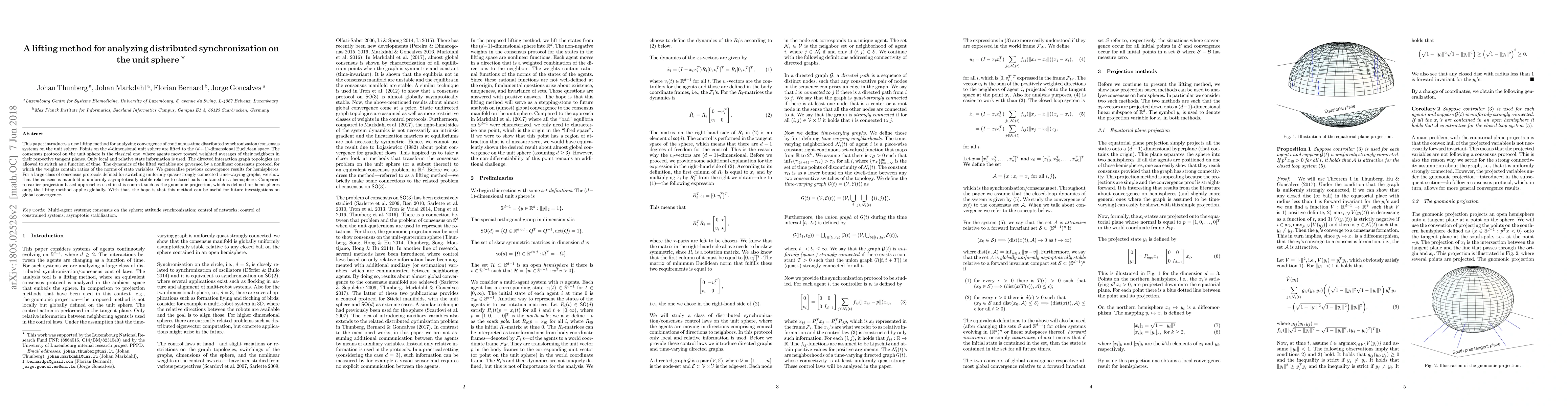 This paper introduces a new lifting method for analyzing convergence of continuous-time distributed synchronization/consensus systems on the unit sphere. Points on the d-dimensional unit sphere are lifted to the (d+1)-dimensional Euclidean space. The consensus protocol on the unit sphere is the classical one, where agents move toward weighted averages of their neighbors in their respective tangent planes. Only local and relative state information is used. The directed interaction graph topologies are allowed to switch as a function of time. The dynamics of the lifted variables are governed by a nonlinear consensus protocol for which the weights contain ratios of the norms of state variables. We generalize previous convergence results for hemispheres. For a large class of consensus protocols defined for switching uniformly quasi-strongly connected time-varying graphs, we show that the consensus manifold is uniformly asymptotically stable relative to closed balls contained in a hemisphere. Compared to earlier projection based approaches used in this context such as the gnomonic projection, which is defined for hemispheres only, the lifting method applies globally. With that, the hope is that this method can be useful for future investigations on global convergence.