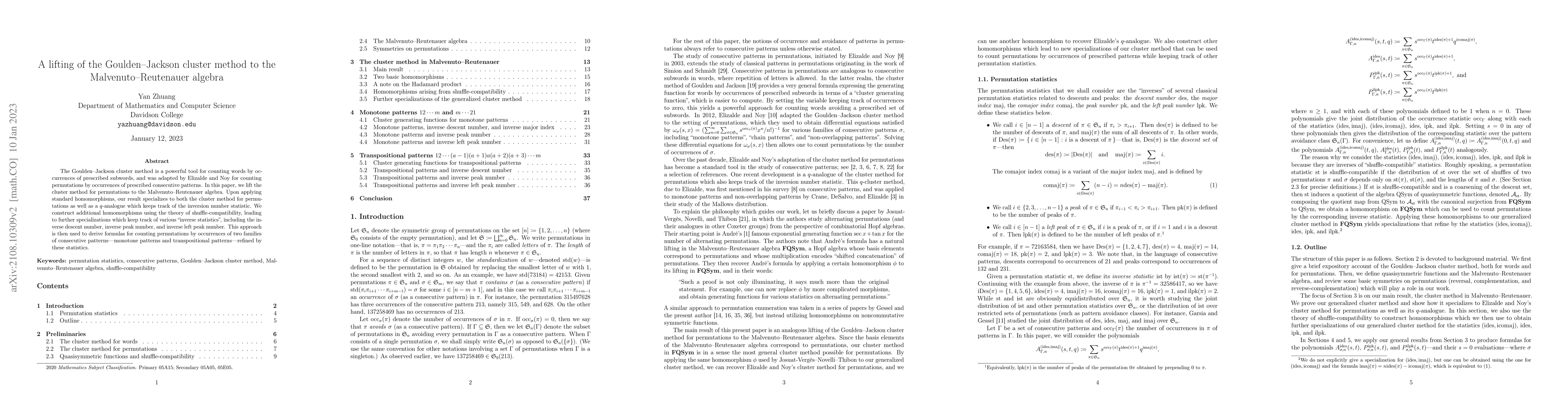 Summary: This paper extends the Goulden-Jackson cluster method to the Malvenuto-Reutenauer algebra, allowing for counting permutations by occurrences of prescribed consecutive patterns. It introduces homomorphisms that specialize to various inversion statistics and applies this to derive refined formulas for permutations with monotone and transpositional patterns.