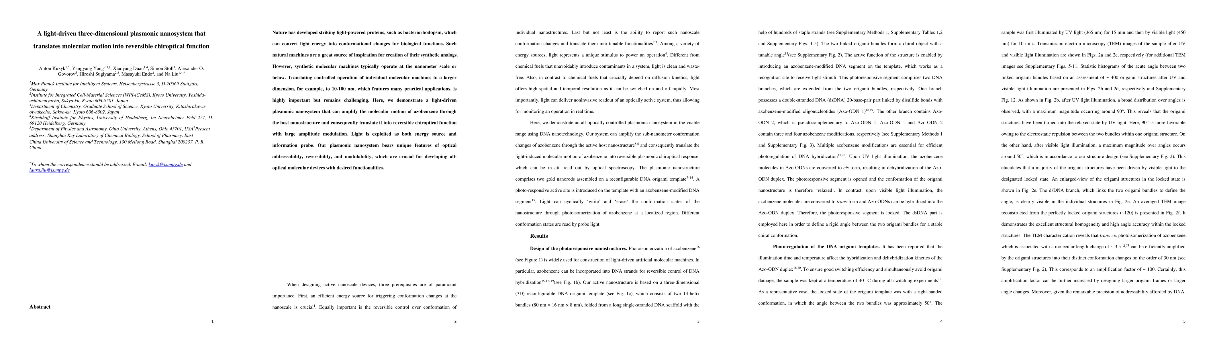 This paper presents a light-driven three-dimensional plasmonic nanosystem that amplifies the motion of azobenzene molecules, translating it into reversible chiroptical functions. The system leverages light for both energy and information, showcasing optical addressability, reversibility, and modulaility for potential all-optical molecular devices.