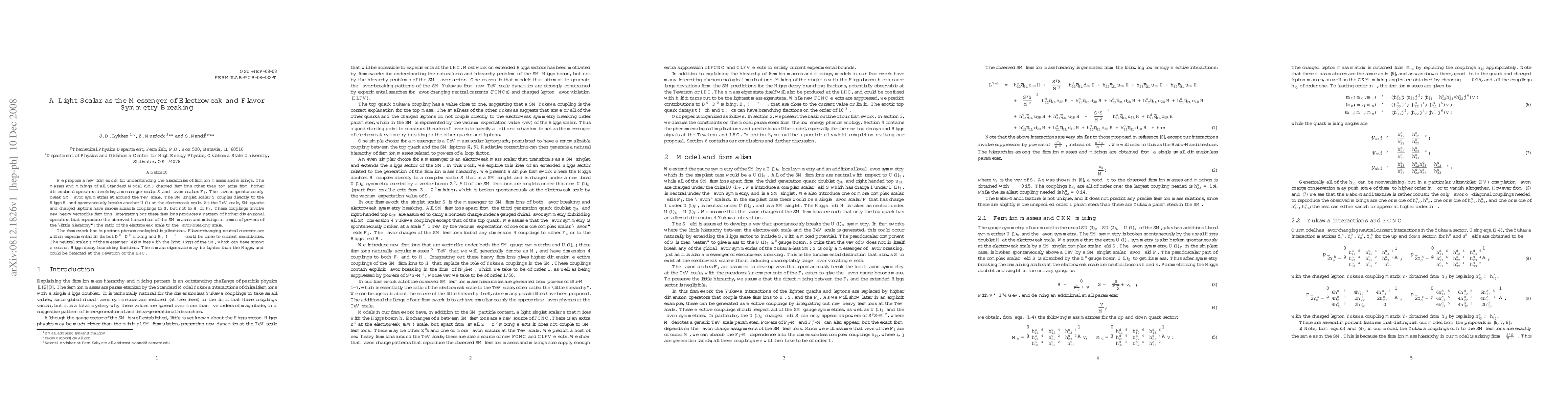 This paper proposes a new framework where a light scalar messenger, S, and flavon scalars F_i explain the hierarchies of Standard Model fermion masses and mixings, with flavor symmetry breaking at the TeV scale and electroweak symmetry breaking at a lower scale. The framework predicts potential new physics effects, including observable phenomena in D^0 mixing and B_s->mu+mu- decays, and a lighter neutral scalar that could be detected at the LHC.