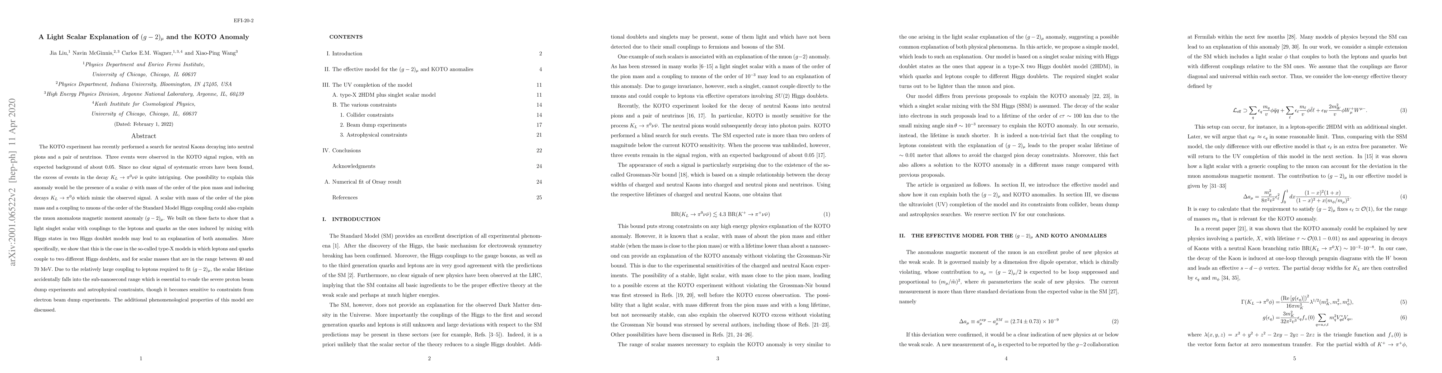 This paper explores a light scalar particle to explain the KOTO anomaly in neutral Kaon decays and the muon anomalous magnetic moment $(g-2)_{\mu}$. It proposes a scalar in the type-X model with masses between 40 and 70 MeV, which can evade experimental constraints due to its relatively short lifetime.