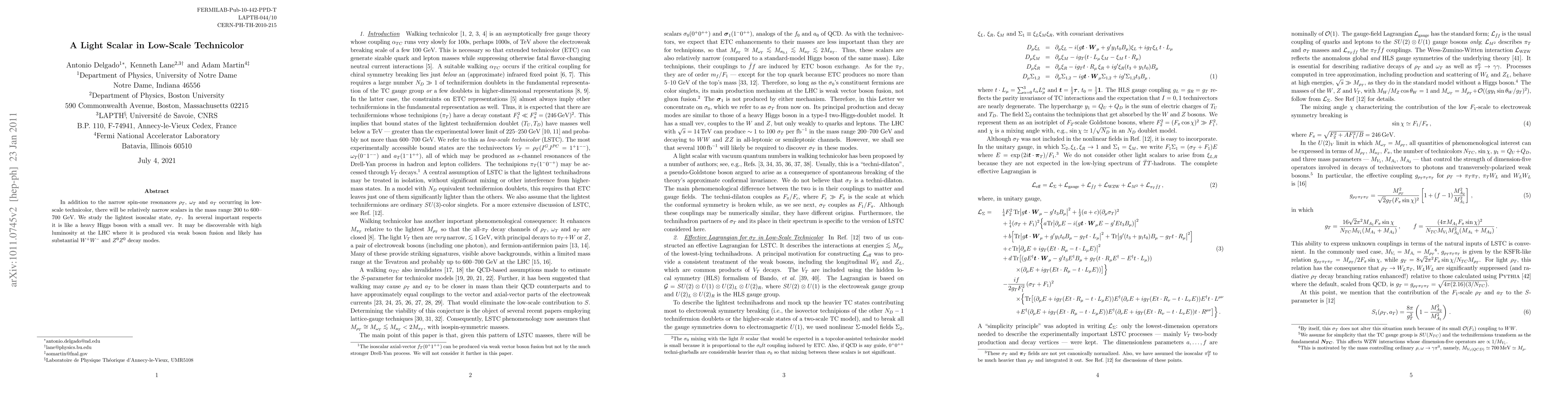 This paper explores the lightest isoscalar scalar, $\sigma_T$, in low-scale technicolor, comparing it to a heavy Higgs boson with a small vev. It suggests that $\sigma_T$ could be discovered at the LHC via weak boson fusion, with significant decay into $W^+ W^-$ and $Z^0Z^0$ pairs.