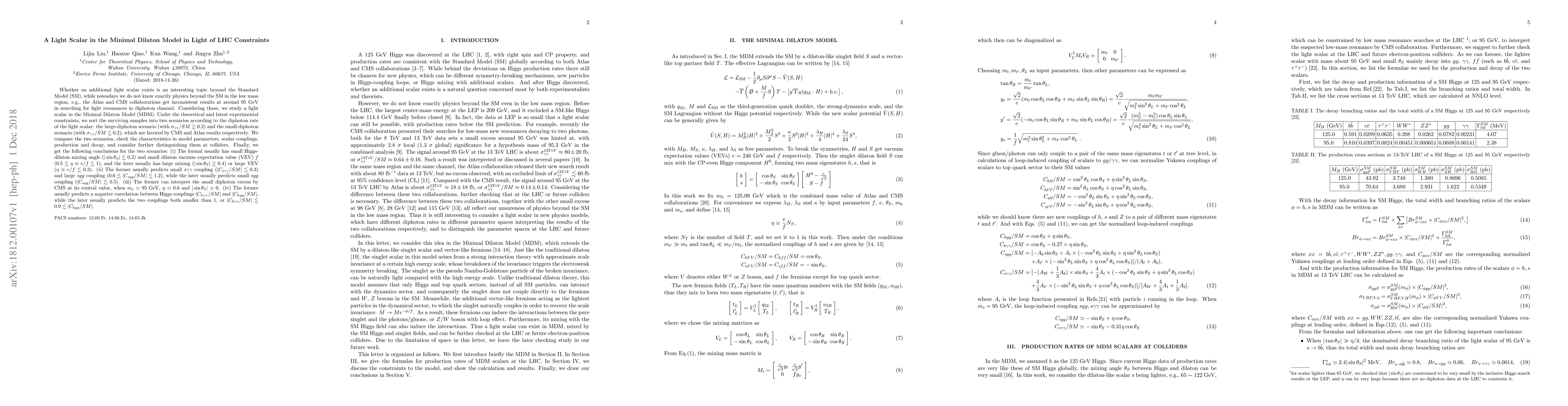 Whether an additional light scalar exists is an interesting topic beyond the Standard Model (SM), while nowadays we do not know exactly physics beyond the SM in the low mass region, e.g., the Atlas and CMS collaborations get inconsistent results at around 95 GeV in searching for light resonances in diphoton channel. Considering these, we study a light scalar in the Minimal Dilaton Model (MDM). Under the theoretical and latest experimental constraints, we sort the surviving samples into two scenarios according to the diphoton rate of the light scalar: the large-diphoton scenario (with $/SM\gtrsim0.2$) and the small-diphoton scenario (with $/SM\lesssim0.2$), which are favored by CMS and Atlas results respectively. We compare the two scenarios, check the characteristics in model parameters, scalar couplings, production and decay, and consider further distinguishing them at colliders. Finally, we get the following conclusions for the two scenarios: (i) The formal usually has small Higgs-dilaton mixing angle ($|\sin\theta_S|\lesssim0.2$) and small dilaton vacuum expectation value (VEV) $f$ ($0.5\lesssim\eta\equiv v/f\lesssim1$), and the later usually has large mixing ($|\sin\theta_S|\gtrsim0.4$) or large VEV ($\eta\equiv v/f\lesssim0.3$). (ii) The former usually predicts small $s\gamma\gamma$ coupling ($|C_{s\gamma\gamma}/SM|\lesssim0.3$) and large $sgg$ coupling ($0.6\lesssim|C_{sgg}/SM|\lesssim1.2$), while the later usually predicts small $sgg$ coupling ($|C_{sgg}/SM|\lesssim0.5$). (iii) The former can interpret the small diphoton excess by CMS at its central value, when $m_s\simeq$95GeV, $\eta\simeq0.6$ and $|\sin\theta_S|\simeq0$. (iv) The former usually predicts a negative correlation between Higgs couplings $|C_{h\gamma\gamma}/SM|$ and $|C_{hgg}/SM|$, while the later usually predicts the two couplings both smaller than 1, or $|C_{h\gamma\gamma}/SM|\lesssim0.9 \lesssim|C_{hgg}/SM|$.