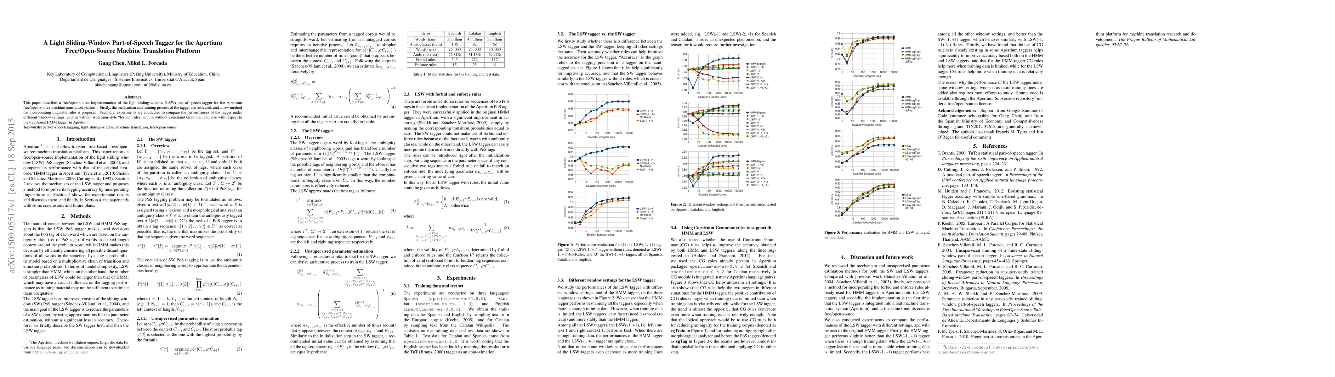 This paper describes a free/open-source implementation of the light sliding-window (LSW) part-of-speech tagger for the Apertium free/open-source machine translation platform. Firstly, the mechanism and training process of the tagger are reviewed, and a new method for incorporating linguistic rules is proposed. Secondly, experiments are conducted to compare the performances of the tagger under different window settings, with or without Apertium-style "forbid" rules, with or without Constraint Grammar, and also with respect to the traditional HMM tagger in Apertium.