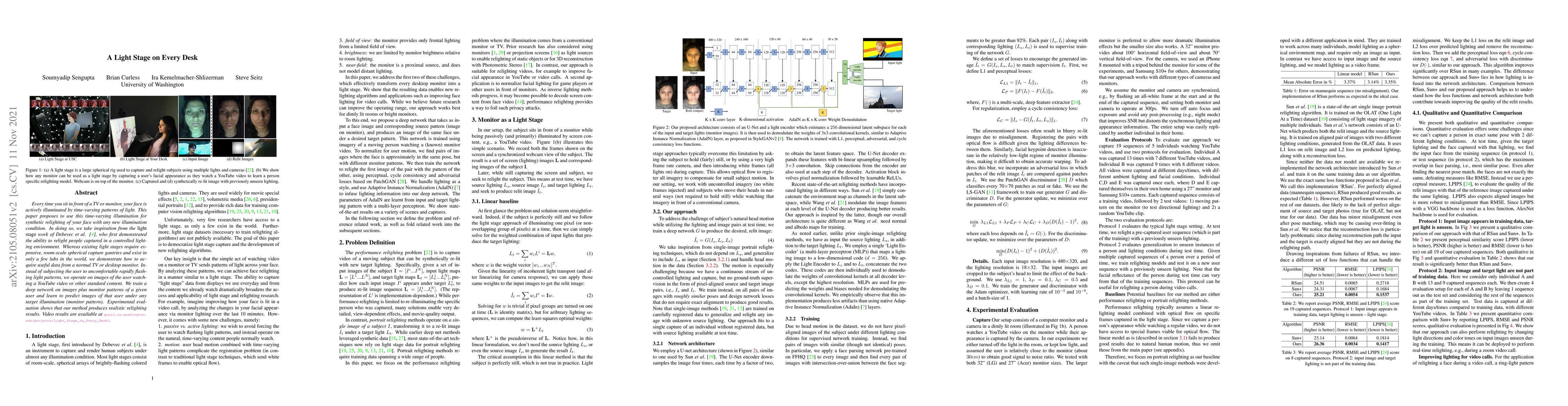 Every time you sit in front of a TV or monitor, your face is actively illuminated by time-varying patterns of light. This paper proposes to use this time-varying illumination for synthetic relighting of your face with any new illumination condition. In doing so, we take inspiration from the light stage work of Debevec et al., who first demonstrated the ability to relight people captured in a controlled lighting environment. Whereas existing light stages require expensive, room-scale spherical capture gantries and exist in only a few labs in the world, we demonstrate how to acquire useful data from a normal TV or desktop monitor. Instead of subjecting the user to uncomfortable rapidly flashing light patterns, we operate on images of the user watching a YouTube video or other standard content. We train a deep network on images plus monitor patterns of a given user and learn to predict images of that user under any target illumination (monitor pattern). Experimental evaluation shows that our method produces realistic relighting results. Video results are available at http://grail.cs.washington.edu/projects/Light_Stage_on_Every_Desk/.
