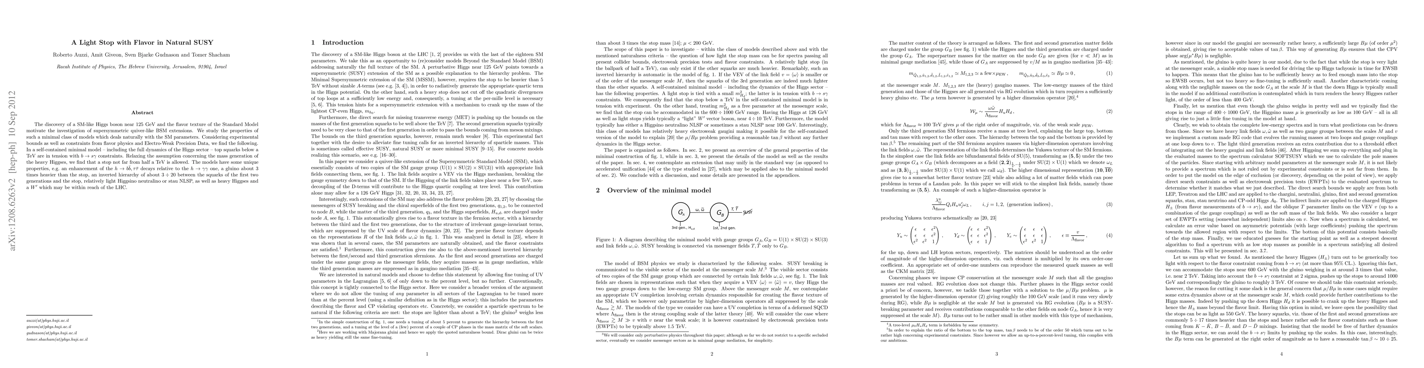 The discovery of a SM-like Higgs boson near 125 GeV and the flavor texture of the Standard Model motivate the investigation of supersymmetric quiver-like BSM extensions. We study the properties of such a minimal class of models which deals naturally with the SM parameters. Considering experimental bounds as well as constraints from flavor physics and Electro-Weak Precision Data, we find the following. In a self-contained minimal model - including the full dynamics of the Higgs sector - top squarks below a TeV are in tension with b->s{\gamma} constraints. Relaxing the assumption concerning the mass generation of the heavy Higgses, we find that a stop not far from half a TeV is allowed. The models have some unique properties, e.g. an enhancement of the h-> b\bar{b},\tau\bar{{\tau}} decays relative to the h->\gamma{\gamma} one, a gluino about 3 times heavier than the stop, an inverted hierarchy of about 3-20 between the squarks of the first two generations and the stop, relatively light Higgsino neutralino or stau NLSP, as well as heavy Higgses and a W' which may be within reach of the LHC.