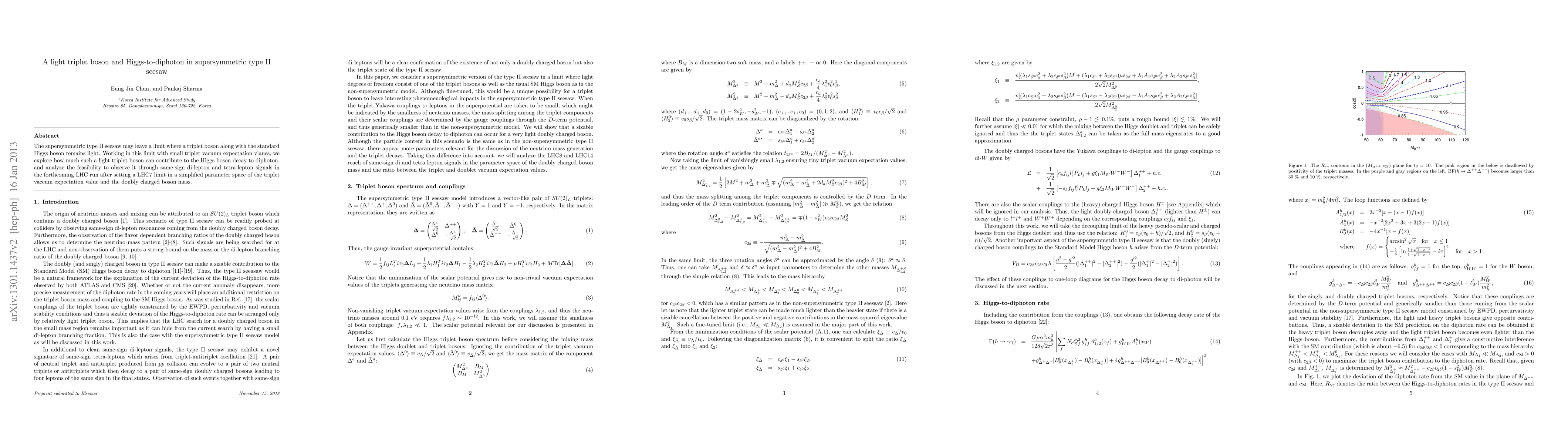 The supersymmetric type II seesaw may leave a limit where a triplet boson along with the standard Higgs boson remains light. Working in this limit with small triplet vacuum expectation vlaues, we explore how much such a light triplet boson can contribute to the Higgs boson decay to diphoton, and analyze the feasibility to observe it through same-sign di-lepton and tetra-lepton signals in the forthcoming LHC run after setting a LHC7 limit in a simplified parameter space of the triplet vaccum expectation value and the doubly charged boson mass.