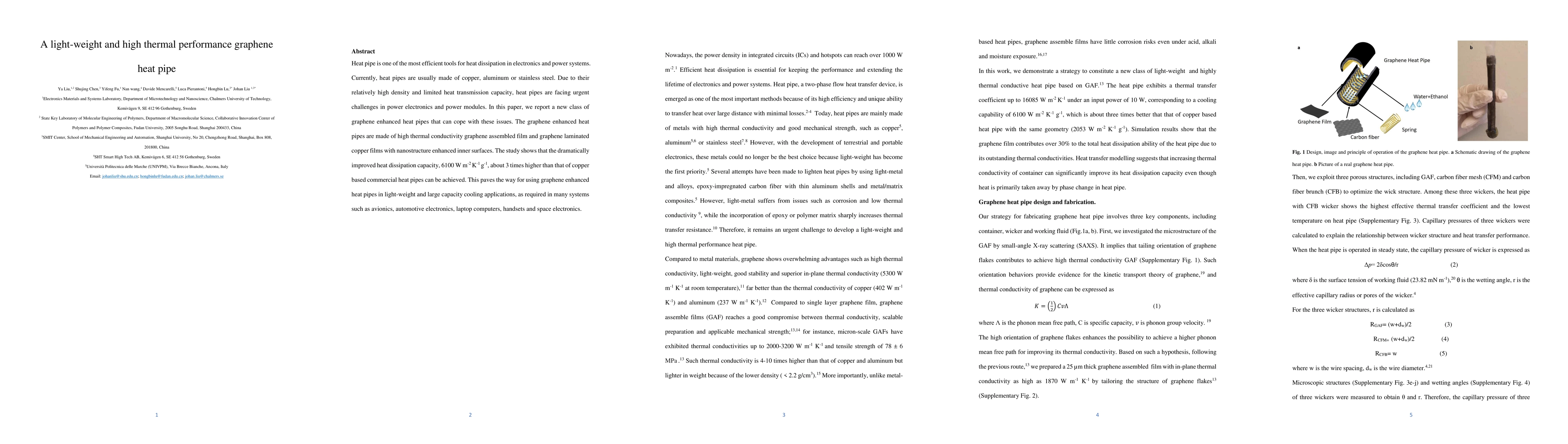 This paper introduces graphene-enhanced heat pipes with significantly higher thermal performance and lower weight compared to traditional copper-based heat pipes. The graphene-based design achieves a heat dissipation capacity of 6100 W m-2 K-1 g-1, about three times better than commercial copper pipes, promising advanced cooling solutions for electronics and power systems.