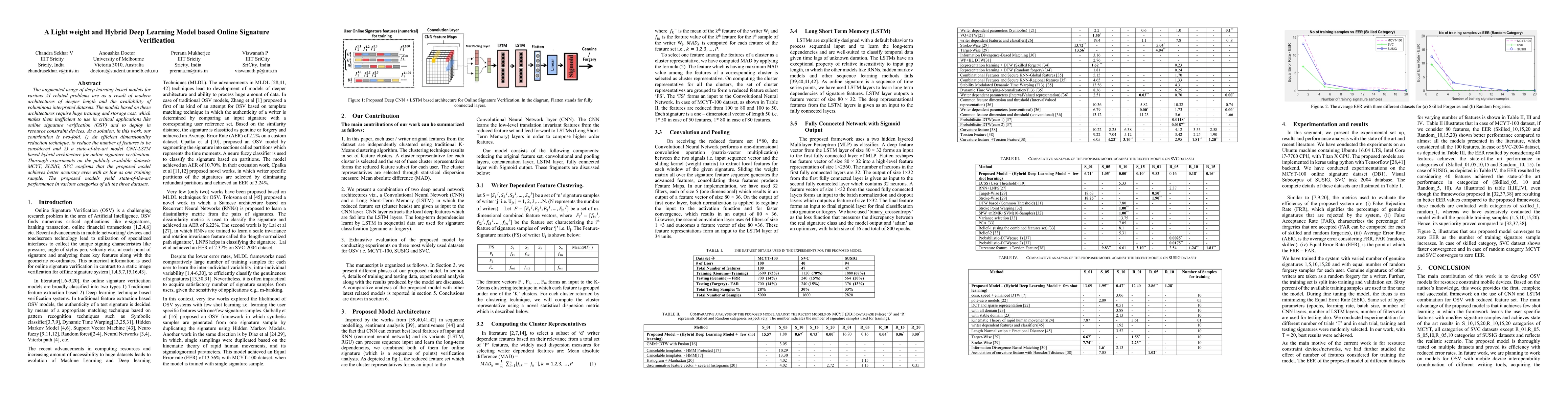 The augmented usage of deep learning-based models for various AI related problems are as a result of modern architectures of deeper length and the availability of voluminous interpreted datasets. The models based on these architectures require huge training and storage cost, which makes them inefficient to use in critical applications like online signature verification (OSV) and to deploy in resource constraint devices. As a solution, in this work, our contribution is two-fold. 1) An efficient dimensionality reduction technique, to reduce the number of features to be considered and 2) a state-of-the-art model CNN-LSTM based hybrid architecture for online signature verification. Thorough experiments on the publicly available datasets MCYT, SUSIG, SVC confirms that the proposed model achieves better accuracy even with as low as one training sample. The proposed models yield state-of-the-art performance in various categories of all the three datasets.