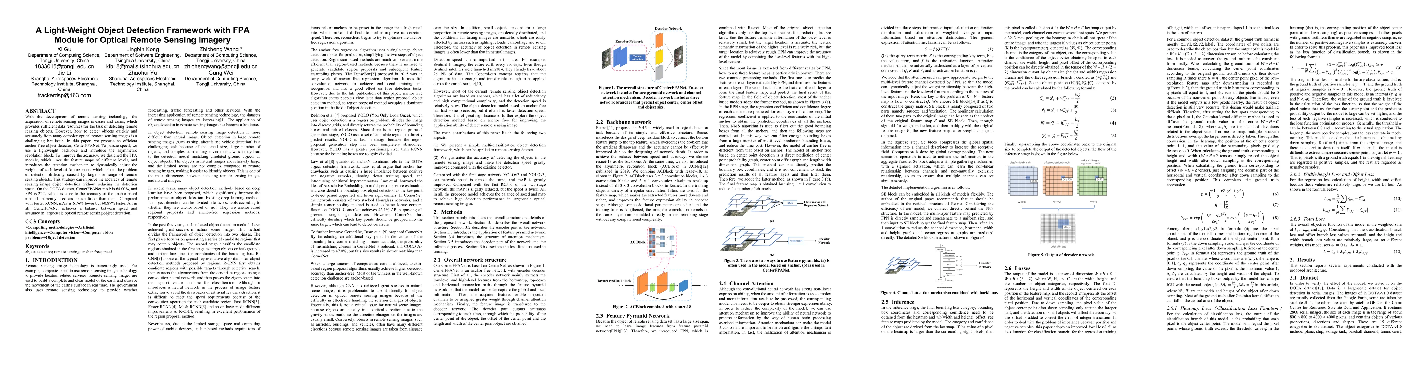 This paper proposes CenterFPANet, an efficient anchor-free object detector for optical remote sensing imagery, utilizing a lightweight backbone and an FPA module to enhance accuracy while maintaining speed. CenterFPANet achieves a mAP of 64.00% and 22.2 FPS on the DOTA dataset, balancing speed and accuracy effectively.