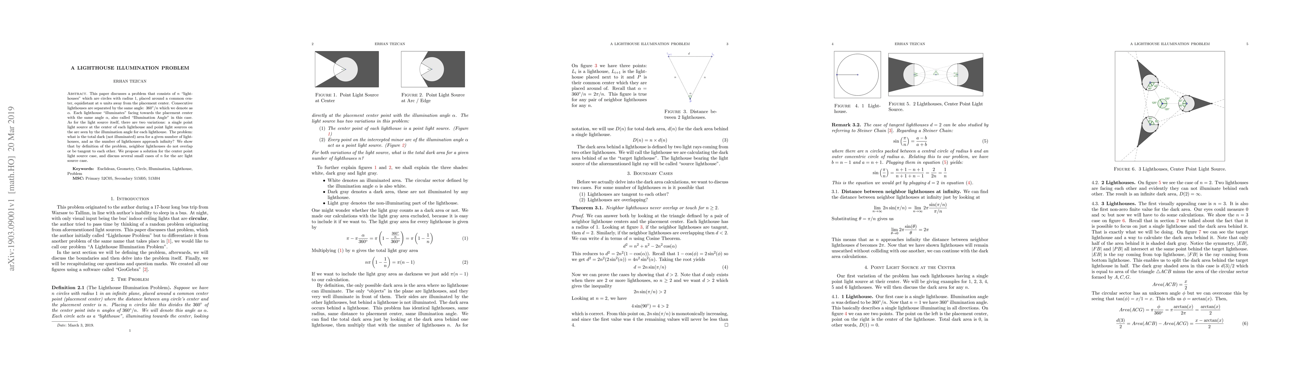 This paper explores the 'Lighthouse Illumination Problem', defining a scenario with n equidistant lighthouses, each having an illumination angle of 360°/n. It calculates the total dark area for a given n and examines the limit as n approaches infinity. Solutions are provided for cases with a central point light source and discusses small cases for an arc light source.