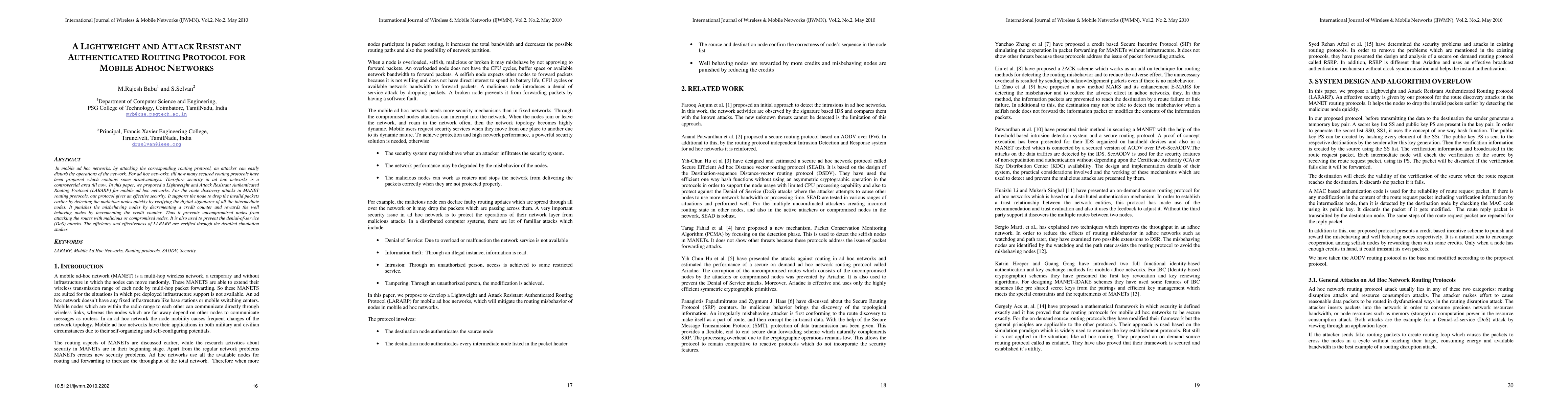 In mobile ad hoc networks, by attacking the corresponding routing protocol, an attacker can easily disturb the operations of the network. For ad hoc networks, till now many secured routing protocols have been proposed which contains some disadvantages. Therefore security in ad hoc networks is a controversial area till now. In this paper, we proposed a Lightweight and Attack Resistant Authenticated Routing Protocol (LARARP) for mobile ad hoc networks. For the route discovery attacks in MANET routing protocols, our protocol gives an effective security. It supports the node to drop the invalid packets earlier by detecting the malicious nodes quickly by verifying the digital signatures of all the intermediate nodes. It punishes the misbehaving nodes by decrementing a credit counter and rewards the well behaving nodes by incrementing the credit counter. Thus it prevents uncompromised nodes from attacking the routes with malicious or compromised nodes. It is also used to prevent the denial-of-service (DoS) attacks. The efficiency and effectiveness of LARARP are verified through the detailed simulation studies.