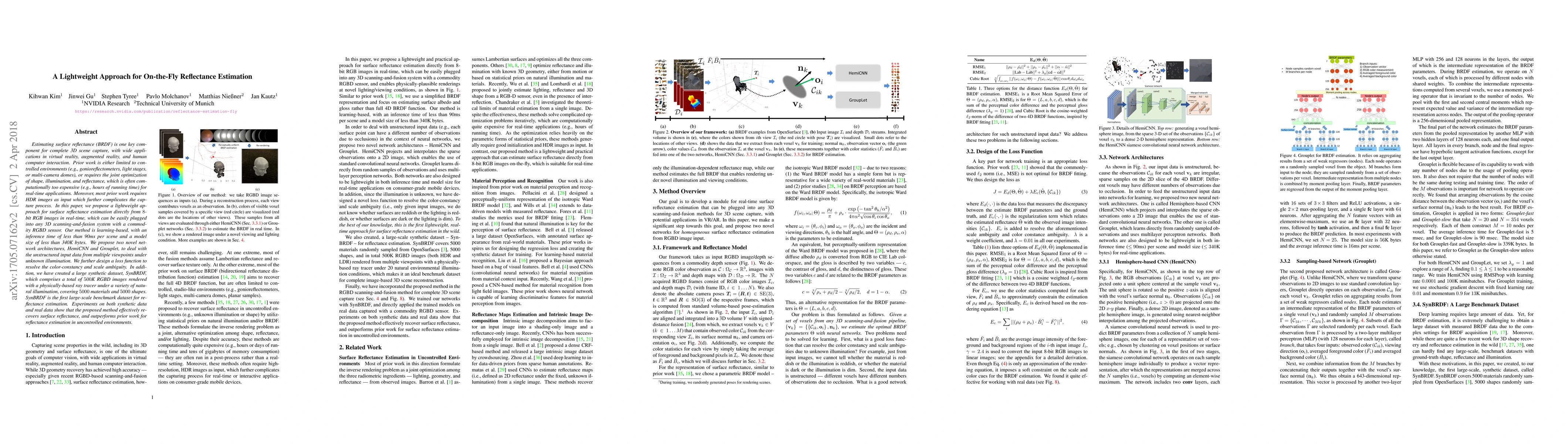 Estimating surface reflectance (BRDF) is one key component for complete 3D scene capture, with wide applications in virtual reality, augmented reality, and human computer interaction. Prior work is either limited to controlled environments (\eg gonioreflectometers, light stages, or multi-camera domes), or requires the joint optimization of shape, illumination, and reflectance, which is often computationally too expensive (\eg hours of running time) for real-time applications. Moreover, most prior work requires HDR images as input which further complicates the capture process. In this paper, we propose a lightweight approach for surface reflectance estimation directly from $8$-bit RGB images in real-time, which can be easily plugged into any 3D scanning-and-fusion system with a commodity RGBD sensor. Our method is learning-based, with an inference time of less than 90ms per scene and a model size of less than 340K bytes. We propose two novel network architectures, HemiCNN and Grouplet, to deal with the unstructured input data from multiple viewpoints under unknown illumination. We further design a loss function to resolve the color-constancy and scale ambiguity. In addition, we have created a large synthetic dataset, SynBRDF, which comprises a total of $500$K RGBD images rendered with a physically-based ray tracer under a variety of natural illumination, covering $5000$ materials and $5000$ shapes. SynBRDF is the first large-scale benchmark dataset for reflectance estimation. Experiments on both synthetic data and real data show that the proposed method effectively recovers surface reflectance, and outperforms prior work for reflectance estimation in uncontrolled environments.