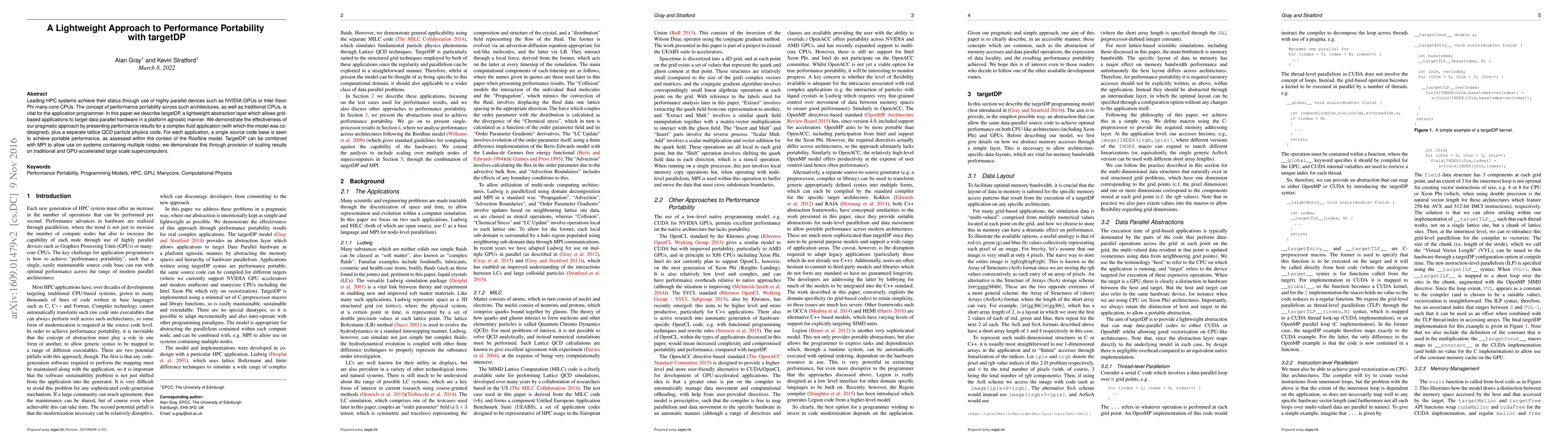 Leading HPC systems achieve their status through use of highly parallel devices such as NVIDIA GPUs or Intel Xeon Phi many-core CPUs. The concept of performance portability across such architectures, as well as traditional CPUs, is vital for the application programmer. In this paper we describe targetDP, a lightweight abstraction layer which allows grid-based applications to target data parallel hardware in a platform agnostic manner. We demonstrate the effectiveness of our pragmatic approach by presenting performance results for a complex fluid application (with which the model was co-designed), plus a separate lattice QCD particle physics code. For each application, a single source code base is seen to achieve portable performance, as assessed within the context of the Roofline model. TargetDP can be combined with MPI to allow use on systems containing multiple nodes: we demonstrate this through provision of scaling results on traditional and GPU-accelerated large scale supercomputers.