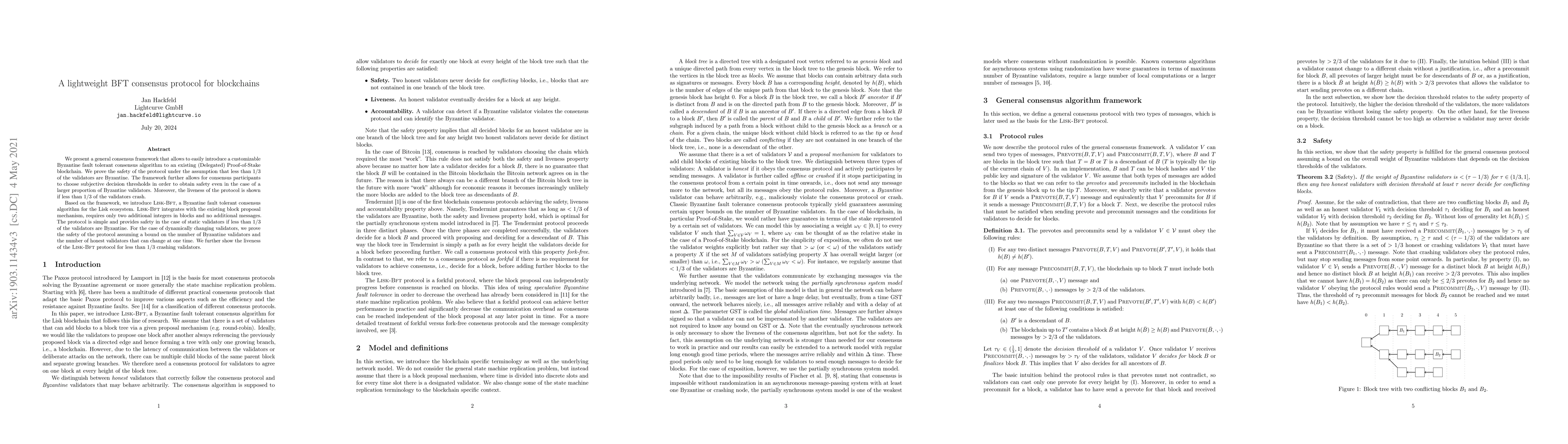We present a general consensus framework that allows to easily introduce a customizable Byzantine fault tolerant consensus algorithm to an existing (Delegated) Proof-of-Stake blockchain. We prove the safety of the protocol under the assumption that less than 1/3 of the validators are Byzantine. The framework further allows for consensus participants to choose subjective decision thresholds in order to obtain safety even in the case of a larger proportion of Byzantine validators. Moreover, the liveness of the protocol is shown if less than 1/3 of the validators crash. Based on the framework, we introduce Lisk-BFT, a Byzantine fault tolerant consensus algorithm for the Lisk ecosystem. Lisk-BFT integrates with the existing block proposal mechanism, requires only two additional integers in blocks and no additional messages. The protocol is simple and provides safety in the case of static validators if less than 1/3 of the validators are Byzantine. For the case of dynamically changing validators, we prove the safety of the protocol assuming a bound on the number of Byzantine validators and the number of honest validators that can change at one time. We further show the liveness of the Lisk-BFT protocol for less than 1/3 crashing validators.