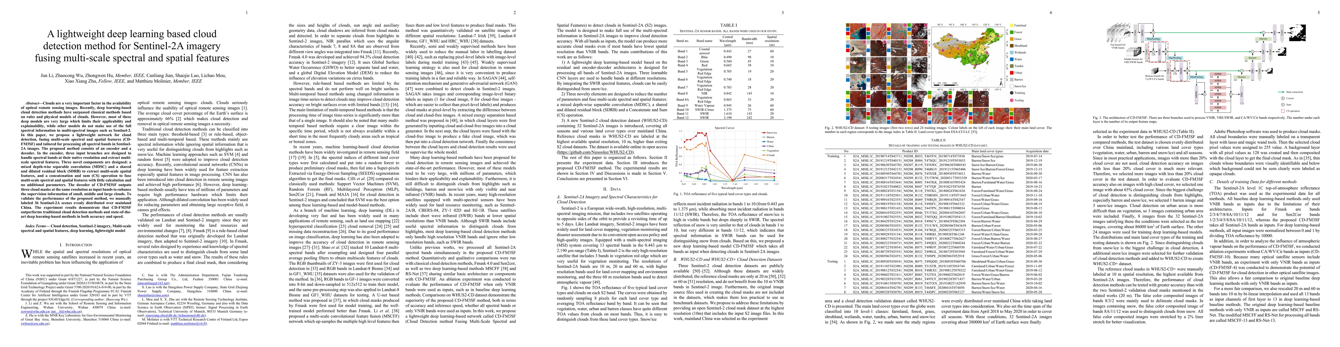 This paper proposes a lightweight deep learning network (CD-FM3SF) for cloud detection in Sentinel-2A imagery, utilizing multi-scale spectral and spatial features. The method outperforms traditional and other deep learning methods in accuracy and speed, addressing the limitations of large models and incomplete spectral feature usage.