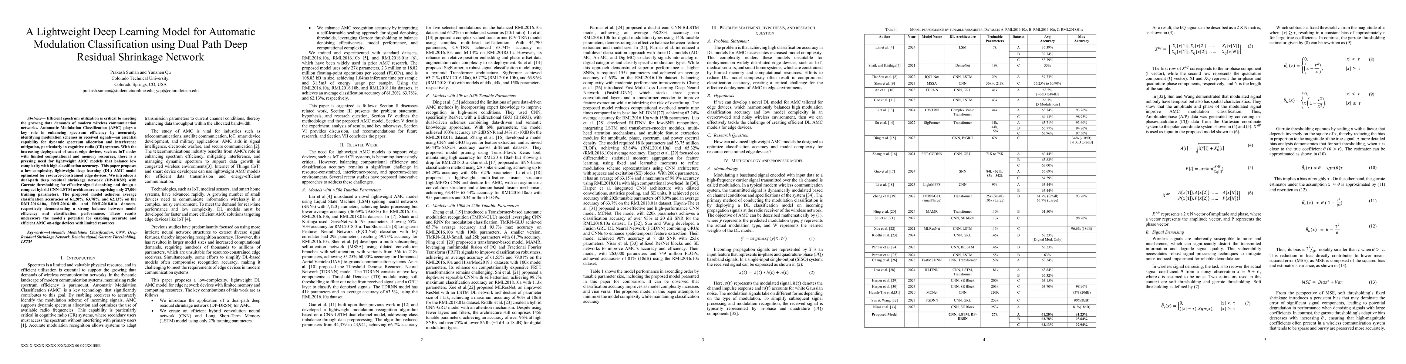 Efficient spectrum utilization is critical to meeting the growing data demands of modern wireless communication networks. Automatic Modulation Classification (AMC) plays a key role in enhancing spectrum efficiency by accurately identifying modulation schemes in received signals-an essential capability for dynamic spectrum allocation and interference mitigation, particularly in cognitive radio (CR) systems. With the increasing deployment of smart edge devices, such as IoT nodes with limited computational and memory resources, there is a pressing need for lightweight AMC models that balance low complexity with high classification accuracy. This paper proposes a low-complexity, lightweight deep learning (DL) AMC model optimized for resource-constrained edge devices. We introduce a dual-path deep residual shrinkage network (DP-DRSN) with Garrote thresholding for effective signal denoising and design a compact hybrid CNN-LSTM architecture comprising only 27,000 training parameters. The proposed model achieves average classification accuracies of 61.20%, 63.78%, and 62.13% on the RML2016.10a, RML2016.10b, and RML2018.01a datasets, respectively demonstrating a strong balance between model efficiency and classification performance. These results underscore the model's potential for enabling accurate and efficient AMC on-edge devices with limited resources.