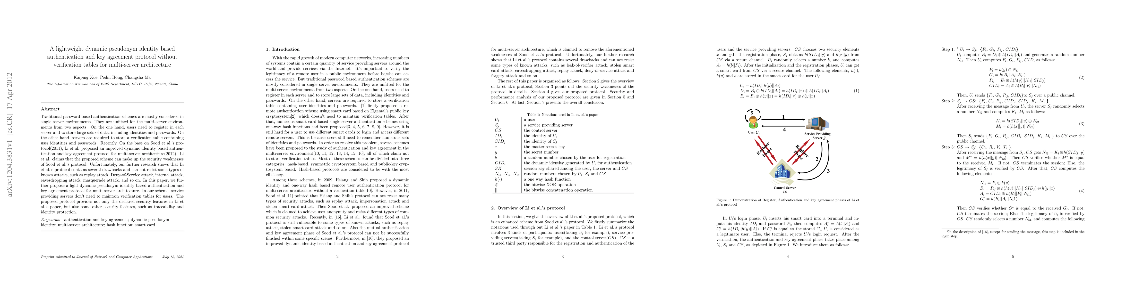 This paper proposes a lightweight dynamic pseudonym identity-based authentication and key agreement protocol for multi-server architecture, addressing the limitations of existing protocols like Li et al.'s (2012) by eliminating the need for verification tables and enhancing security against various attacks including replay, DoS, internal, eavesdropping, and masquerade attacks.