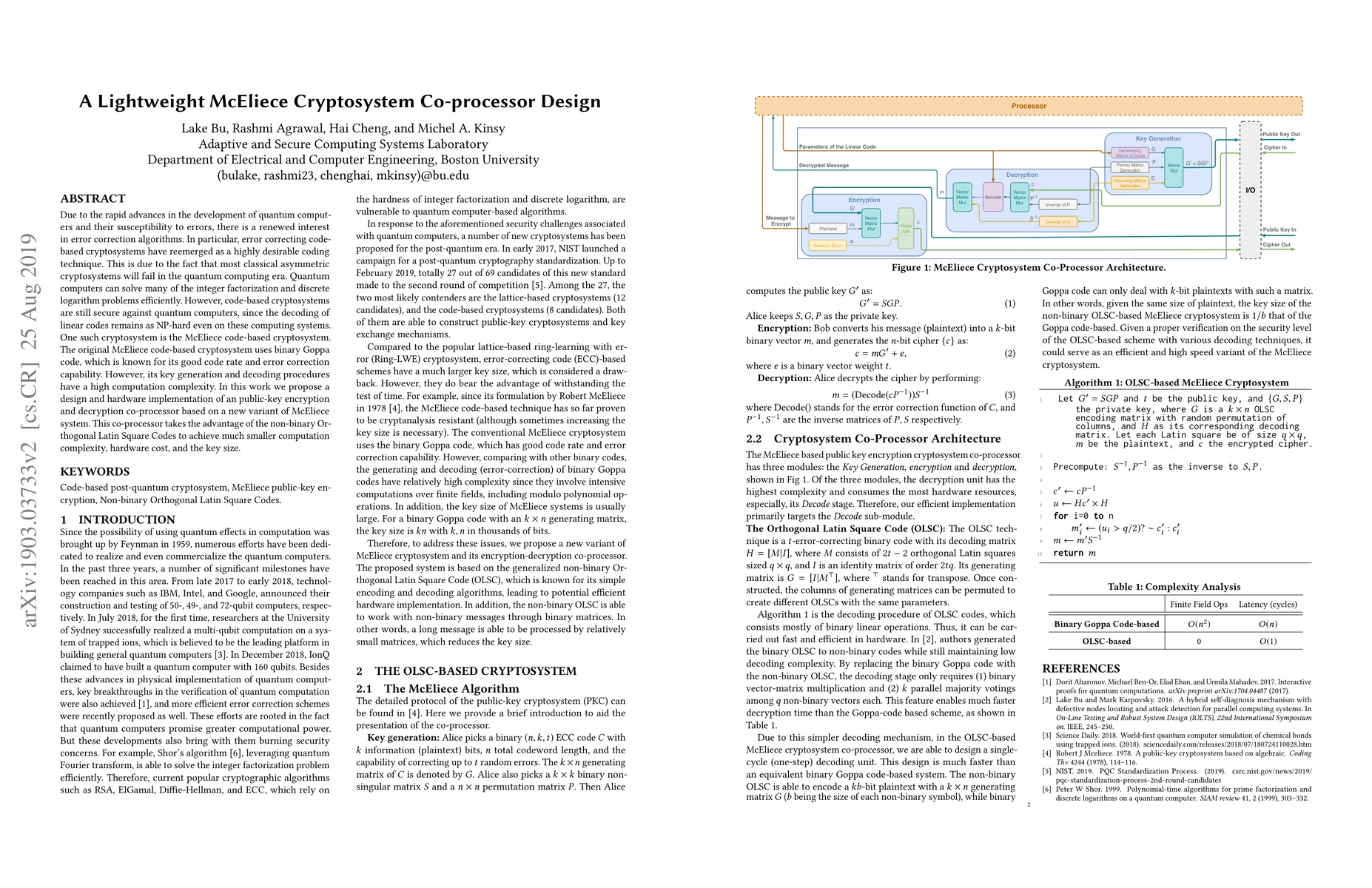 Due to the rapid advances in the development of quantum computers and their susceptibility to errors, there is a renewed interest in error correction algorithms. In particular, error correcting code-based cryptosystems have reemerged as a highly desirable coding technique. This is due to the fact that most classical asymmetric cryptosystems will fail in the quantum computing era. Quantum computers can solve many of the integer factorization and discrete logarithm problems efficiently. However, code-based cryptosystems are still secure against quantum computers, since the decoding of linear codes remains as NP-hard even on these computing systems. One such cryptosystem is the McEliece code-based cryptosystem. The original McEliece code-based cryptosystem uses binary Goppa code, which is known for its good code rate and error correction capability. However, its key generation and decoding procedures have a high computation complexity. In this work we propose a design and hardware implementation of an public-key encryption and decryption co-processor based on a new variant of McEliece system. This co-processor takes the advantage of the non-binary Orthogonal Latin Square Codes to achieve much smaller computation complexity, hardware cost, and the key size.