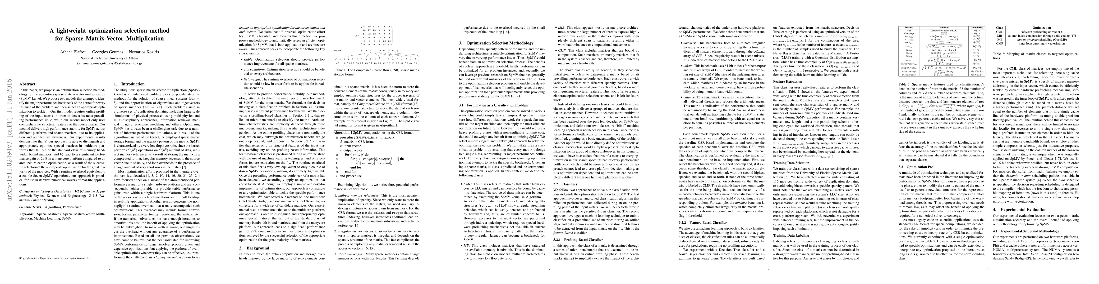 This paper introduces an optimization selection methodology for sparse matrix-vector multiplication (SpMV) that identifies performance bottlenecks and selects appropriate optimizations. Experimental results show a 29% performance gain on manycore platforms and high stability across different matrices, with minimal runtime overhead.