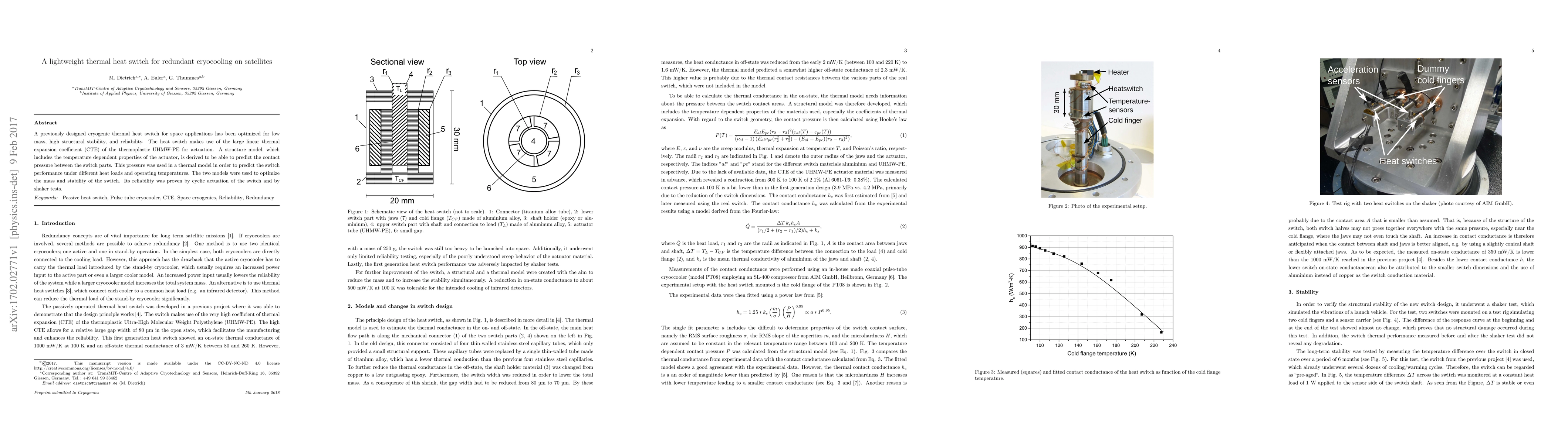 This paper optimizes a cryogenic thermal heat switch for satellite use, focusing on low mass and high structural stability. The switch utilizes the thermoplastic UHMW-PE's thermal expansion for actuation, with models predicting contact pressure and performance under various conditions, validated by cyclic and shaker tests.