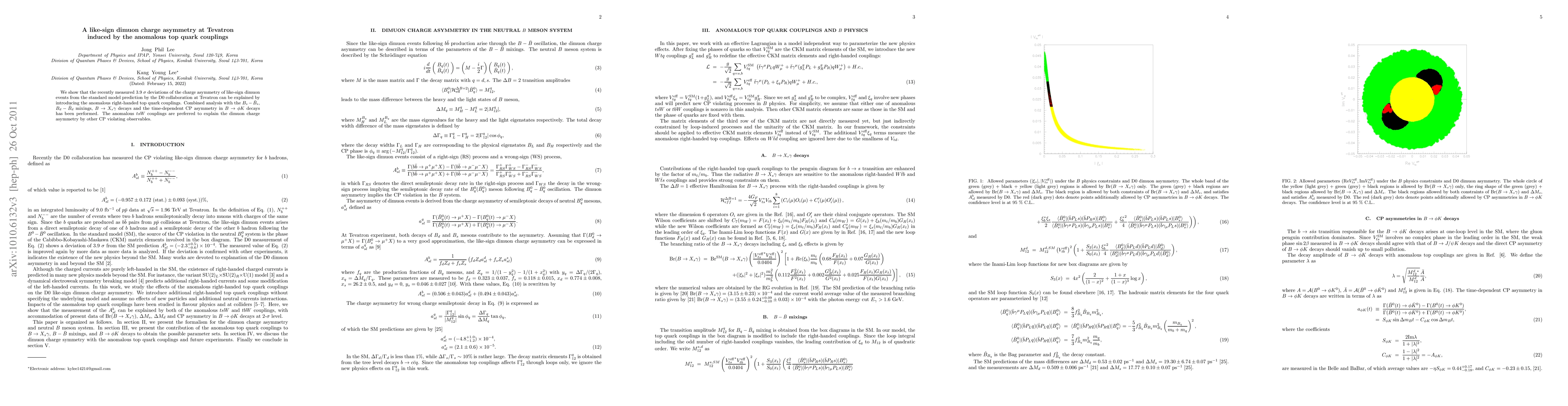 We show that the recently measured 3.2 $\sigma$ deviations of the charge asymmetry of like-sign dimuon events from the standard model prediction by the D0 collaboration at Tevatron can be explained by introducing the anomalous right-handed top quark couplings. Combined analysis with the $\bs$ and $\bd$ mixings and $B \to X_s \gamma$ decays has been performed. We discuss how to discriminate the effects on the dimuon charge asymmetry of the anomalous $\tsW$ and $\tbW$ couplings.